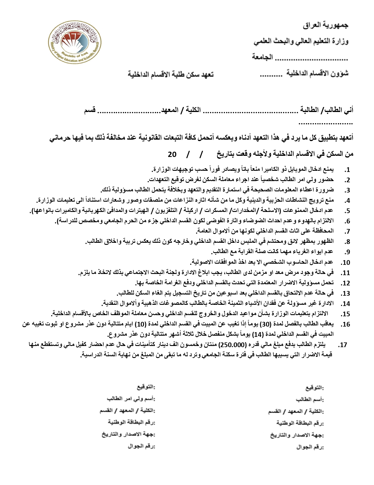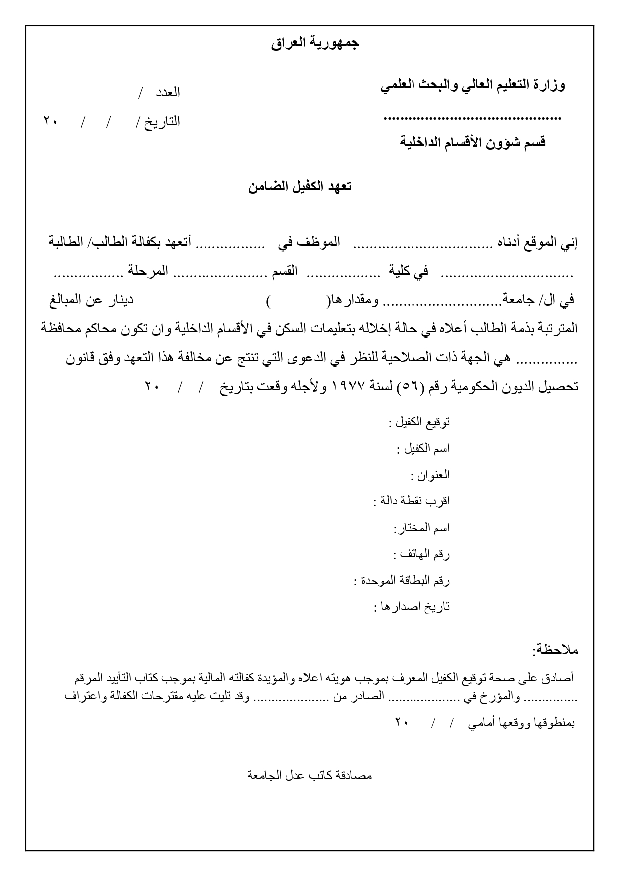 5- تعهد الطالب وتعهد الكفيل الضامن على ورقة حجم A4 مرفق بكتاب تأييد الكفالة المالية للكفيل معنون الى الأقسام الداخلية.