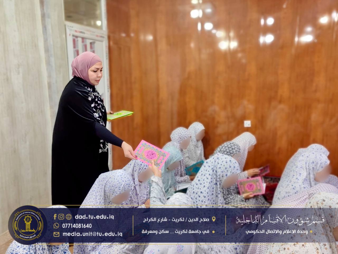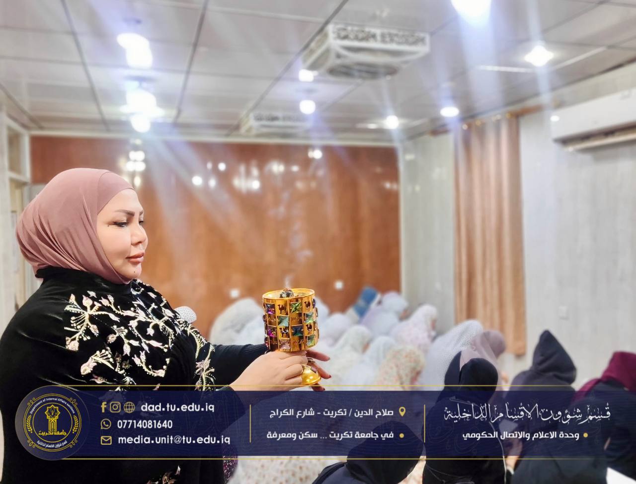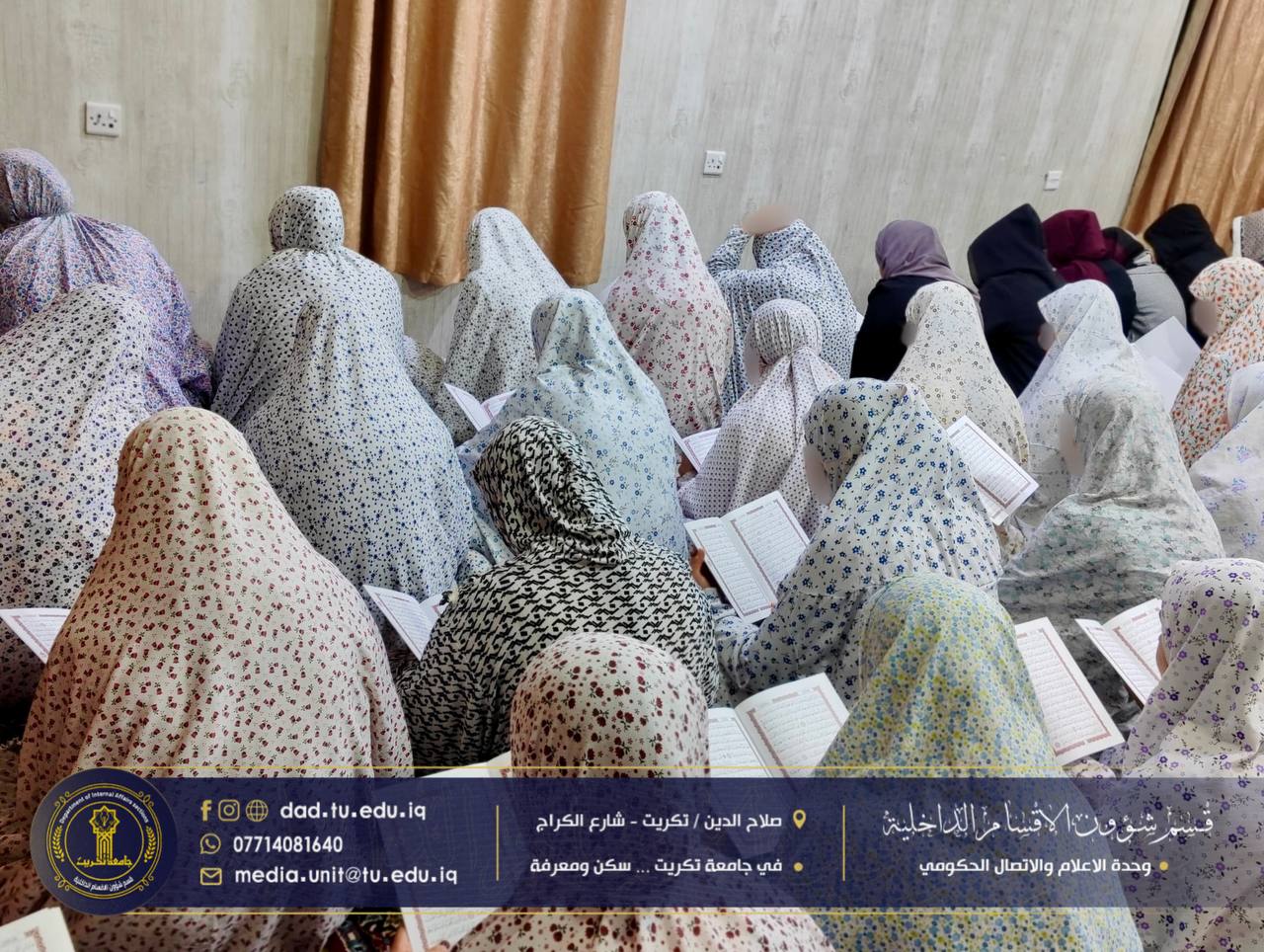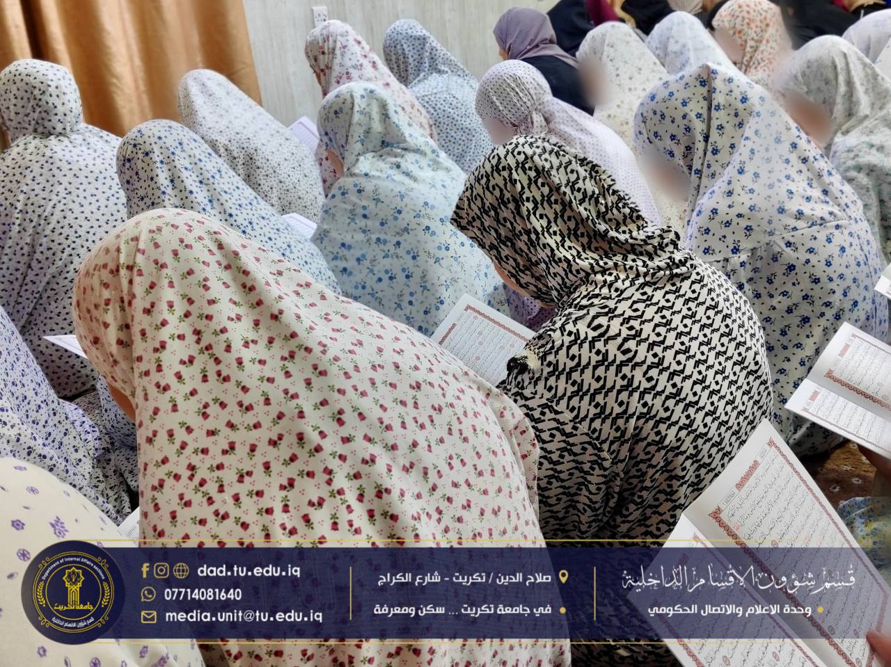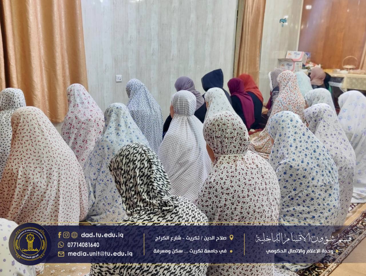 وتضمنت الأمسية إقامة ختمة مباركة للقرآن الكريم تلتها قراءة دعاء جماعي ابتهلت فيه الطالبات إلى الله عزّ وجلّ بأن يعمّ الخير والسلام أرجاء عراقنا الحبيب، وأن تنعم مدينتنا تكريت المعطاء بالأمن والاستقرار، وأن يلهم طلبتنا الأعزاء التوفيق والنجاح في مسيرتهم العلمية.