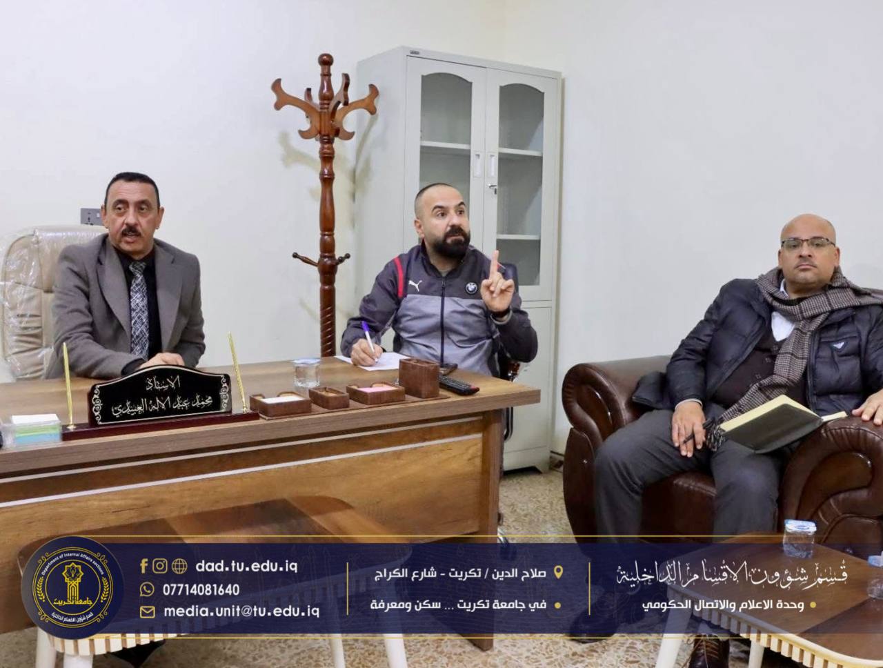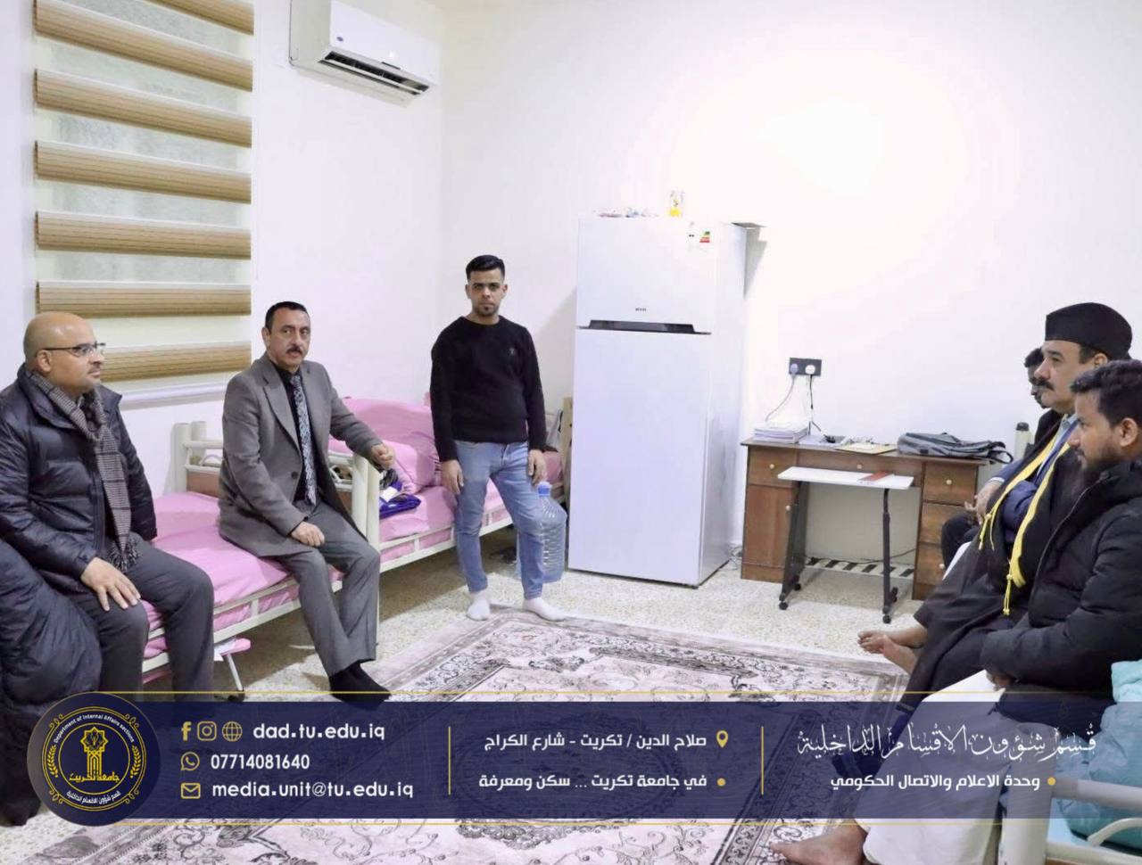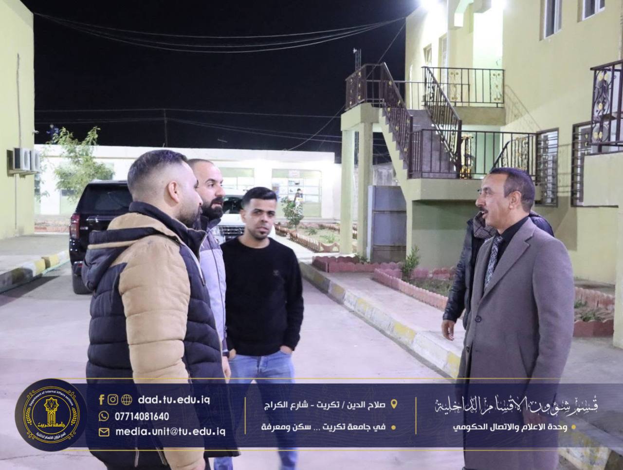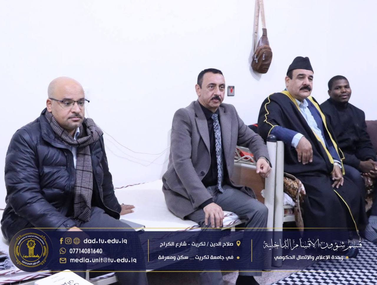 في إطار الحرص على متابعة أوضاع الطلبة والاطلاع المباشر على مستوى الخدمات المقدمة لهم، أجرى السيد عميد كلية التربية للعلوم الإنسانية الأستاذ الدكتور عماد حميد أحمد، يرافقه السيد معاون العميد للشؤون الإدارية الأستاذ الدكتور عادل صالح علاوي، والسيد معاون العميد لشؤون الطلبة الأستاذ الدكتور مثنى مشعان خلف، مساء يوم الاثنين الموافق (19/1/2026)، زيارة تفقدية إلى مجمع الاقواس في الأقسام الداخلية.
