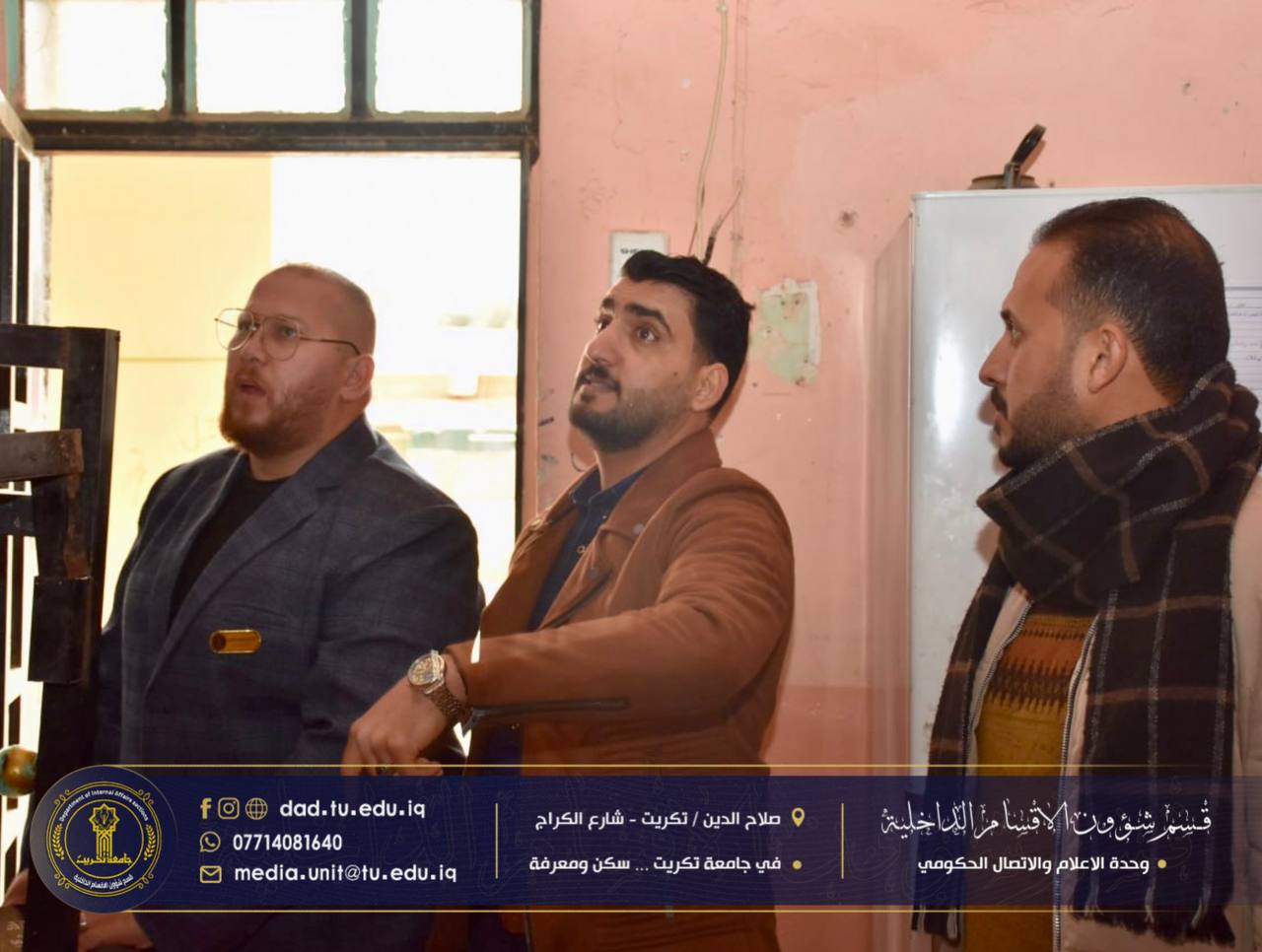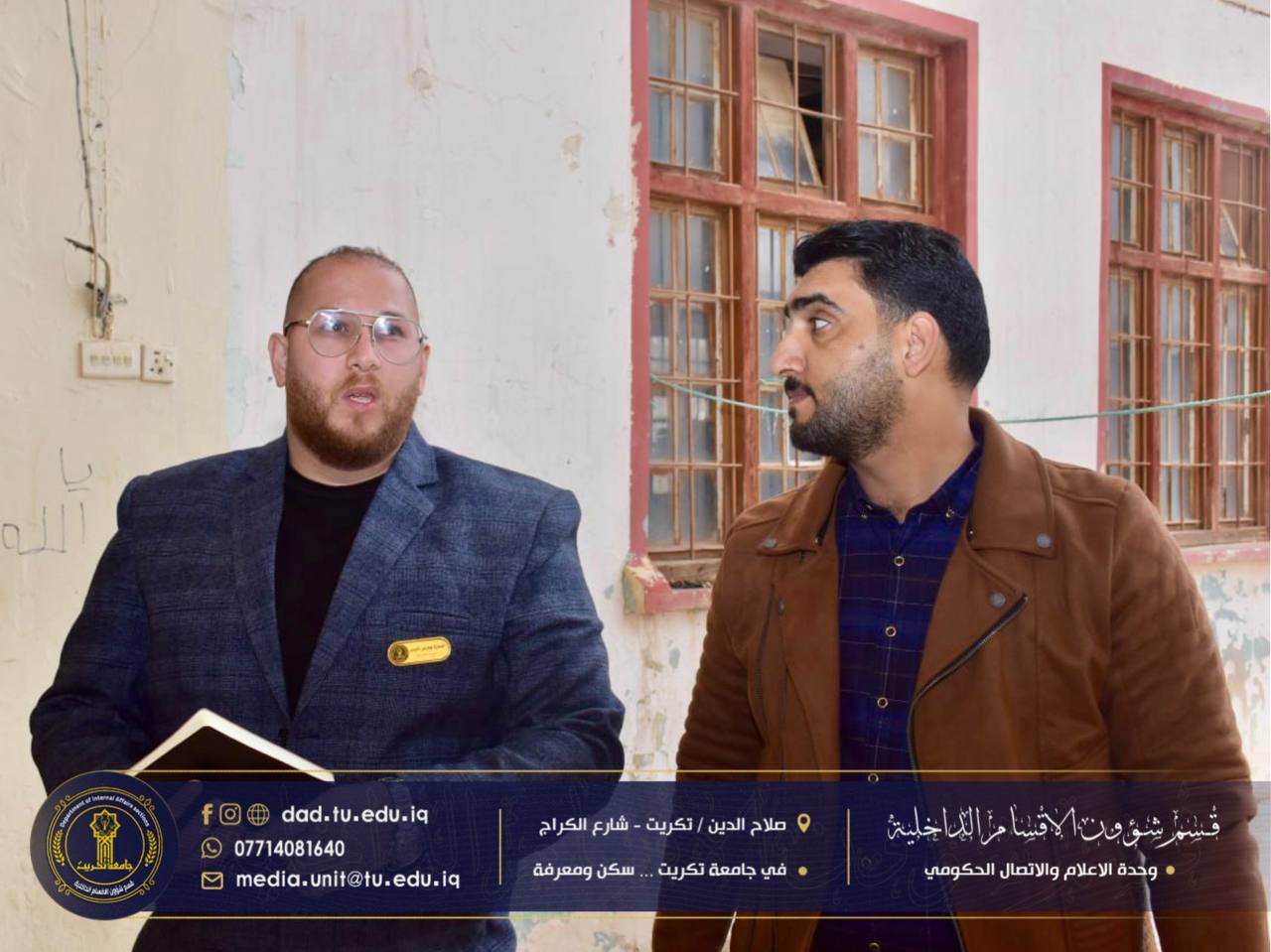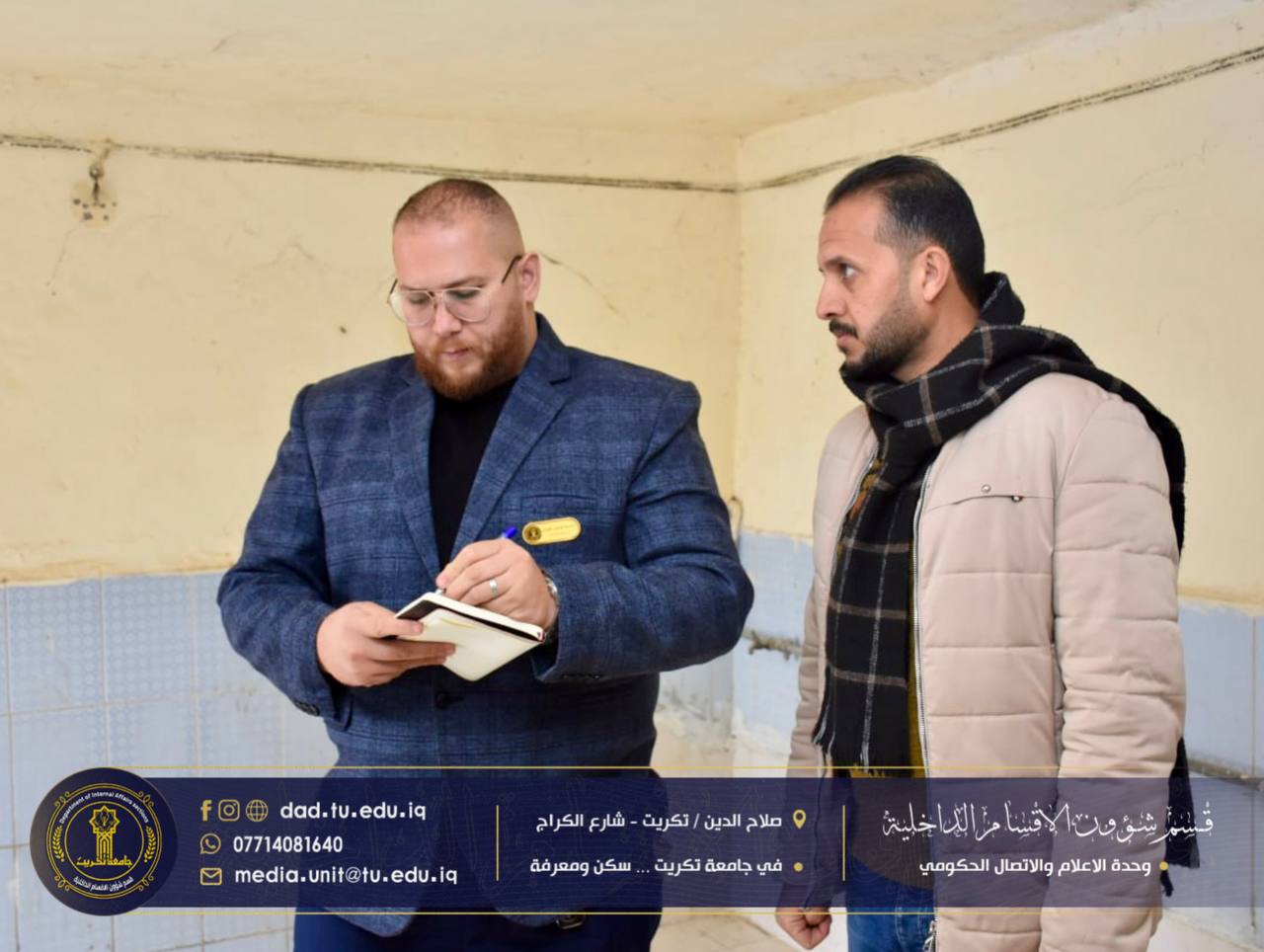 وضمّت اللجنة كلاً من الأستاذ المساعد الدكتور طه غافل عبدالله معاون مدير الأقسام الداخلية لشؤون الطلاب، والمهندس الحمزة وميض فارس مسؤول الوحدة الهندسية، حيث أجرت جولة ميدانية شاملة شملت الغرف السكنية والبنى التحتية.