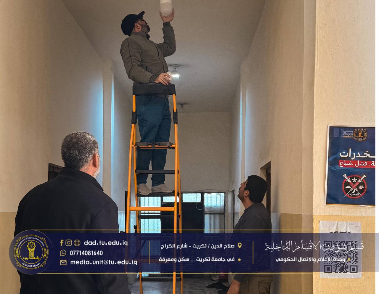 في إطار جهود قسم شؤون الأقسام الداخلية للحفاظ على جودة الخدمات والمرافق، قامت شعبة الصيانة بمتابعة أعمال الصيانة في مجمعات القادسية، مجمع الطالبات، وقسم 1 للدراسات العليا.