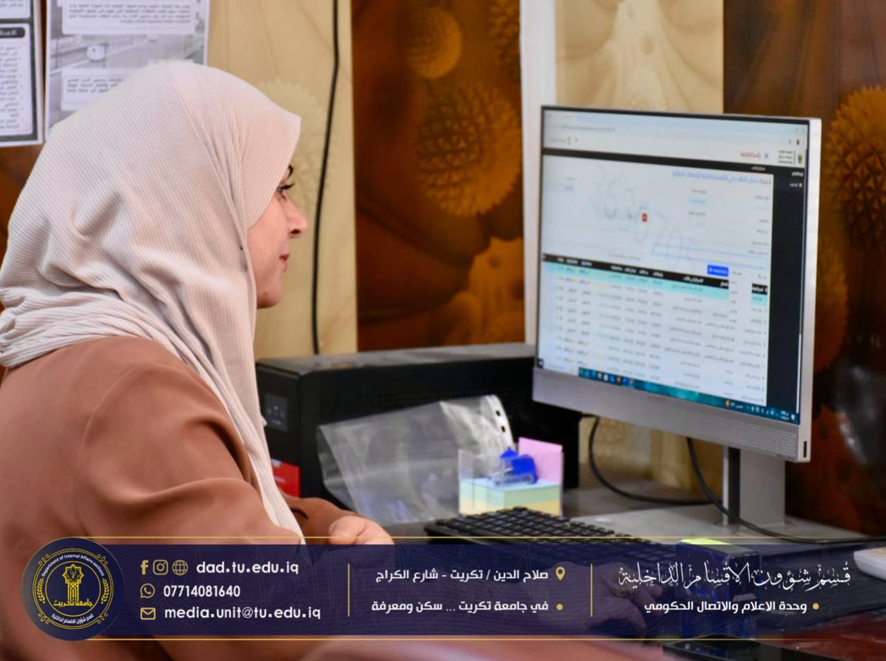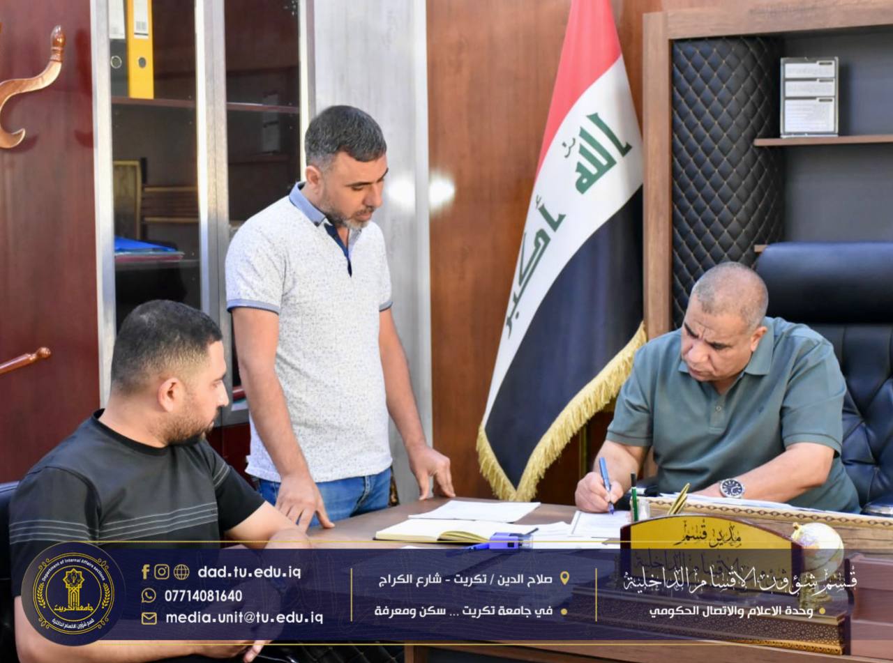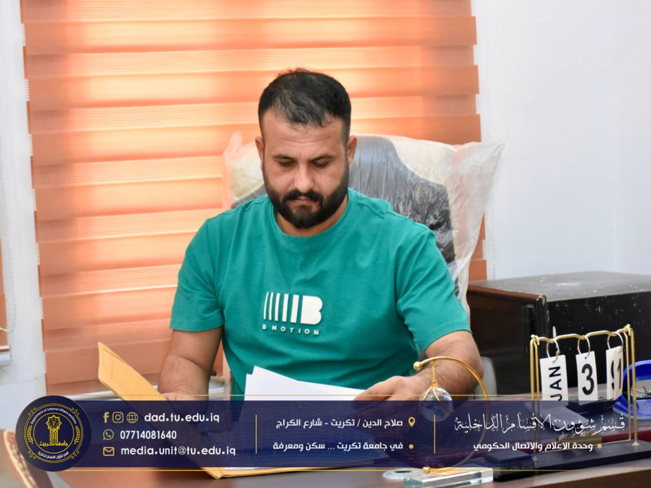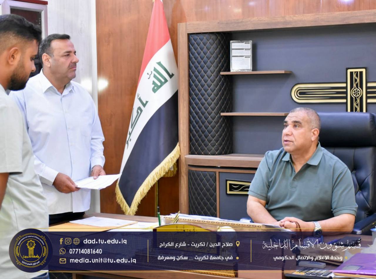 ضمن إطار المتابعة الميدانية المستمرة لسير العمل الإداري، تابع مدير قسم شؤون الأقسام الداخلية في جامعة تكريت الأستاذ الدكتور جاسم عباس علي أعمال الشعب والوحدات الإدارية في القسم، واطلع على آلية إنجاز الكتب الرسمية وتنظيم الأرشفة الورقية والإلكترونية، فضلاً عن متابعة الإحتياجات والمشاكل المتعلقة بالطلبة.
