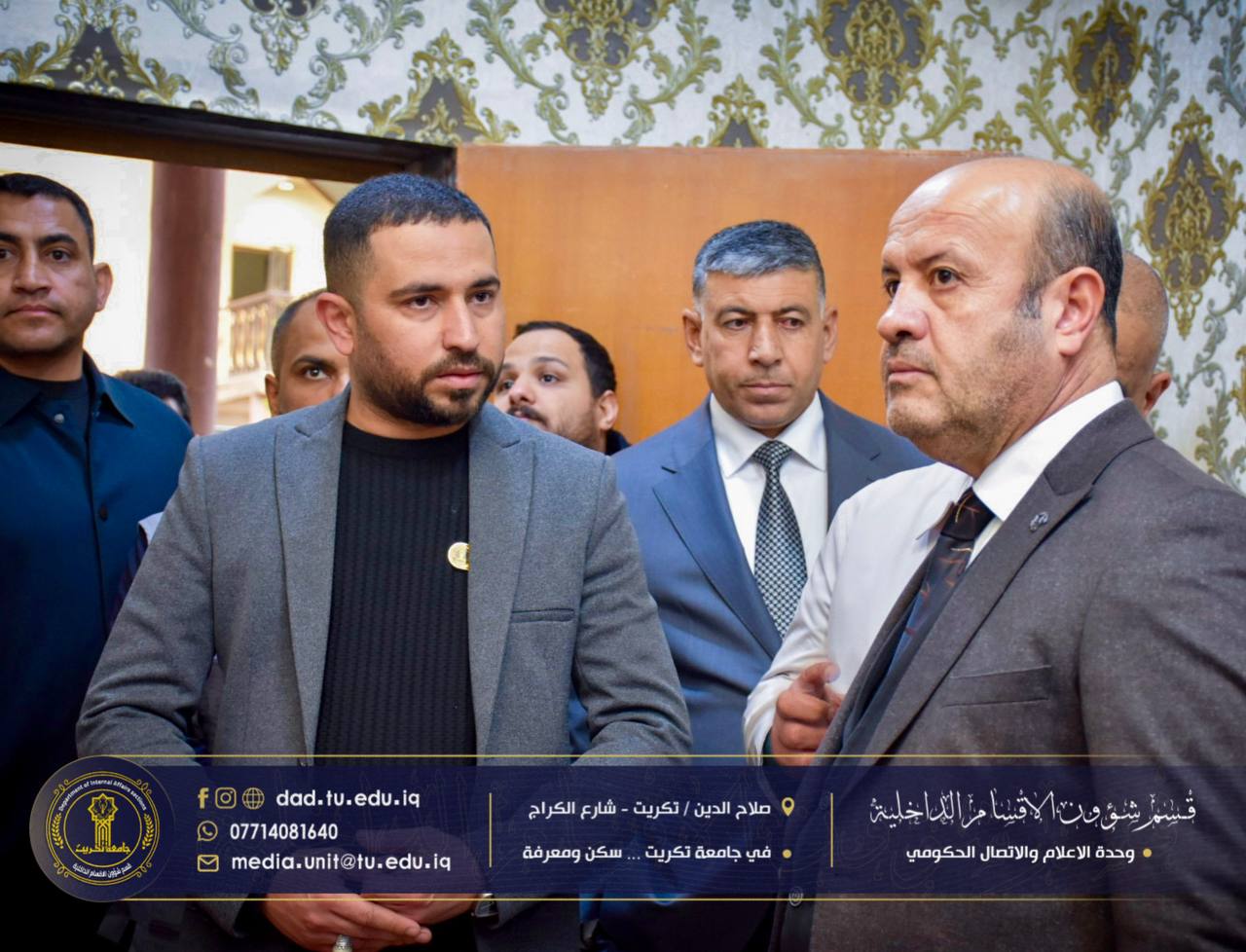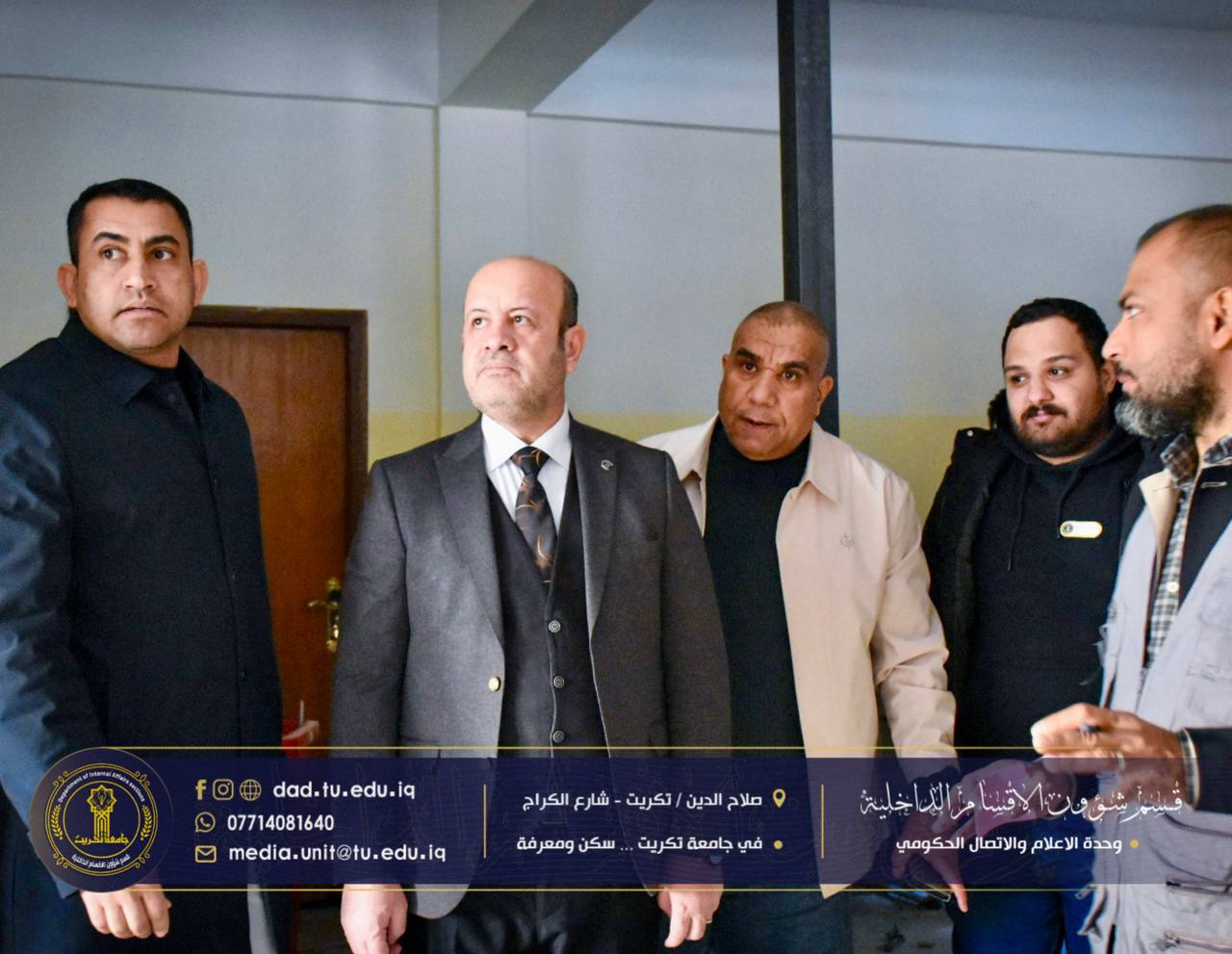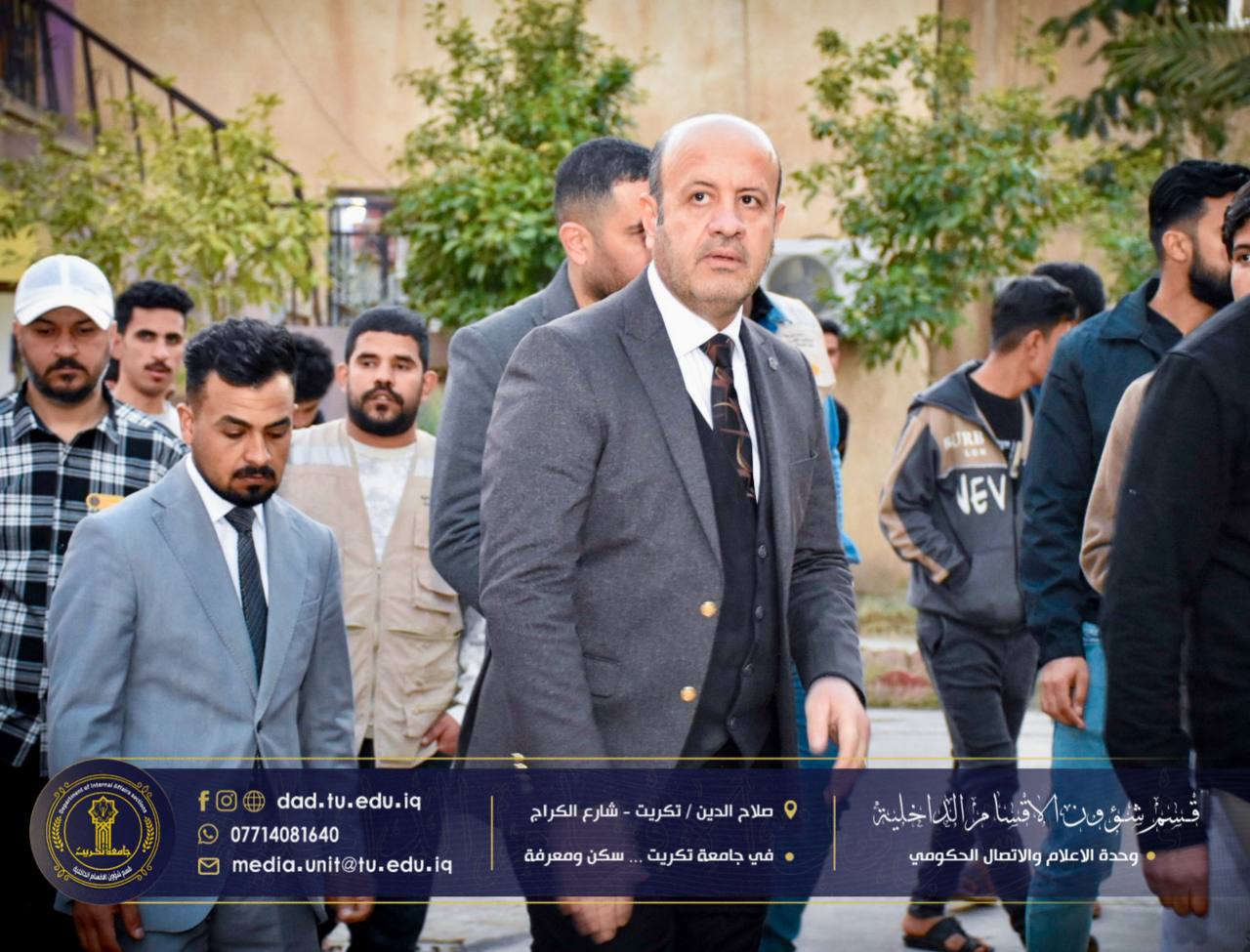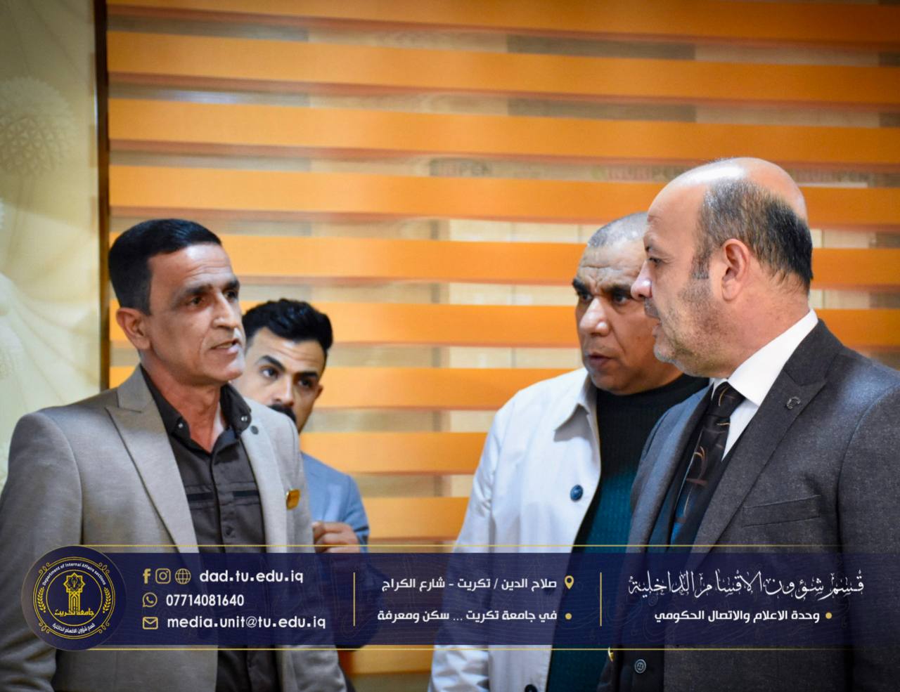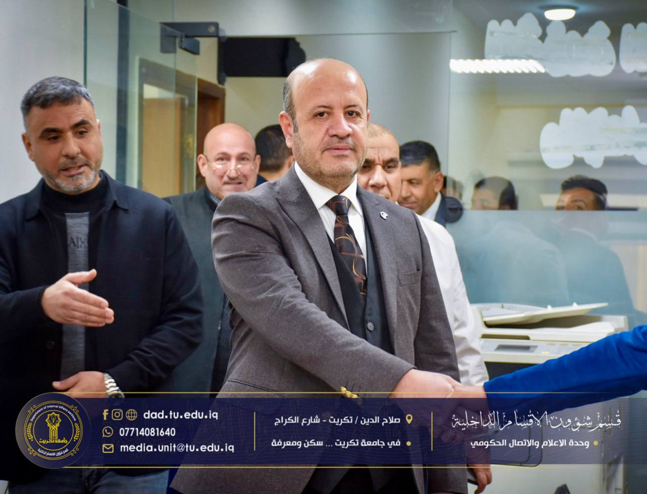 أجرى رئيس جامعة تكريت الأستاذ الدكتور وعد محمود رؤوف المحترم زيارة إلى مقر قسم شؤون الأقسام الداخلية، يرافقه المساعد الإداري الأستاذ الدكتور حامد محمد صالح، وكان في استقبالهم الأستاذ الدكتور جاسم عباس علي مدير قسم شؤون الأقسام الداخلية، إلى جانب الكادر المتقدم في القسم من مسؤولي الشعب والوحدات.