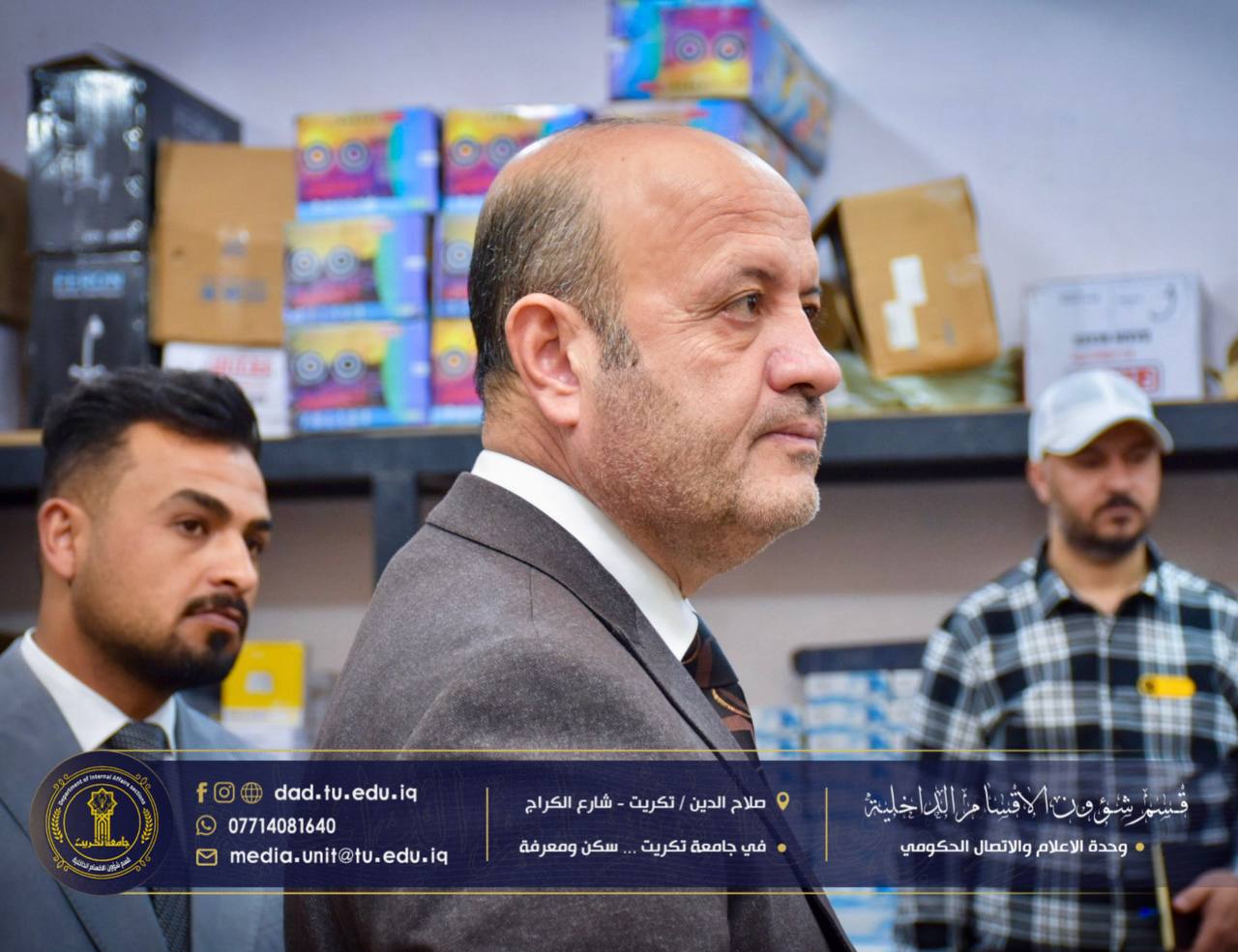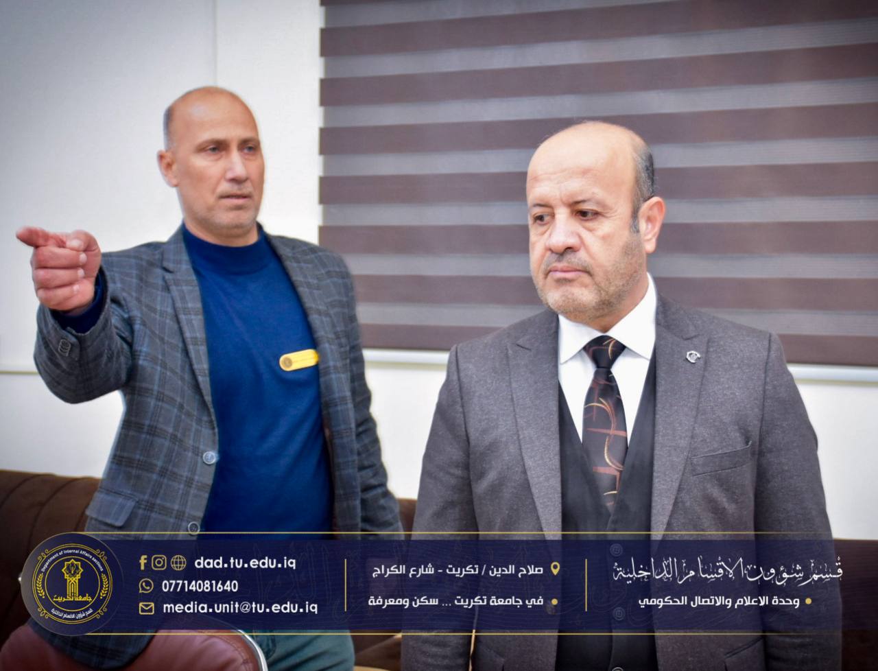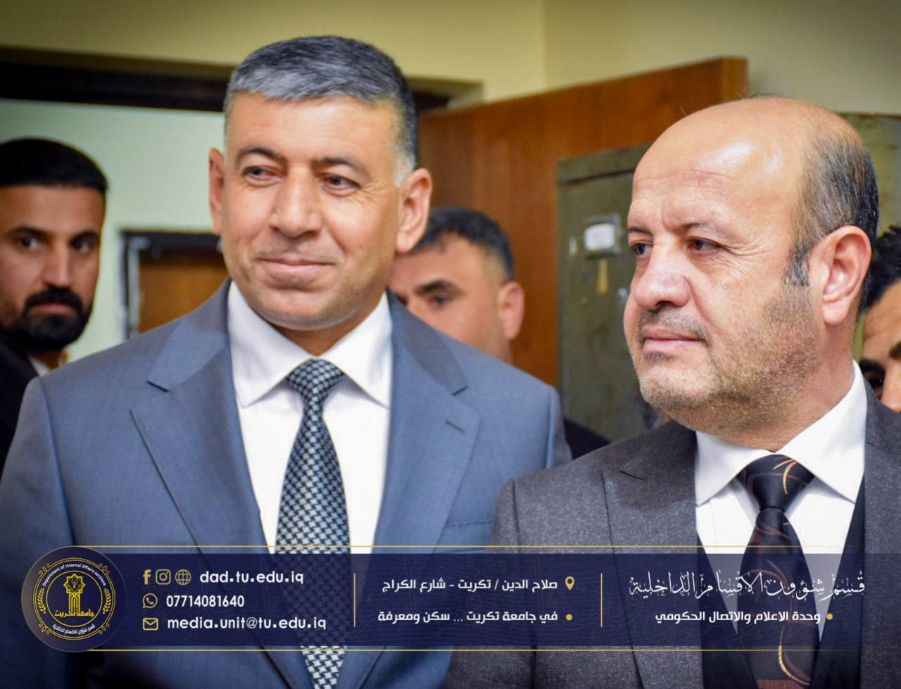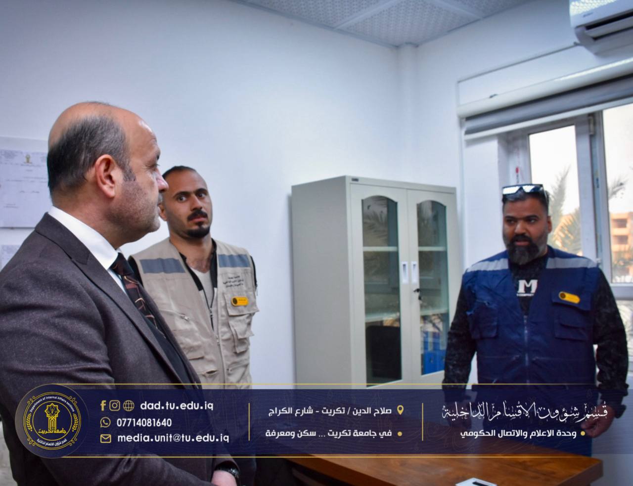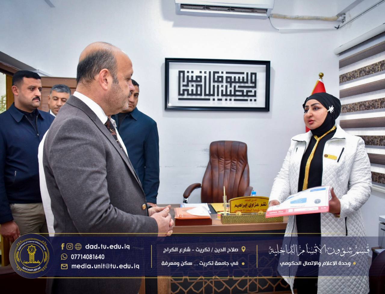 أجرى رئيس جامعة تكريت الأستاذ الدكتور وعد محمود رؤوف المحترم زيارة إلى مقر قسم شؤون الأقسام الداخلية، يرافقه المساعد الإداري الأستاذ الدكتور حامد محمد صالح، وكان في استقبالهم الأستاذ الدكتور جاسم عباس علي مدير قسم شؤون الأقسام الداخلية، إلى جانب الكادر المتقدم في القسم من مسؤولي الشعب والوحدات.