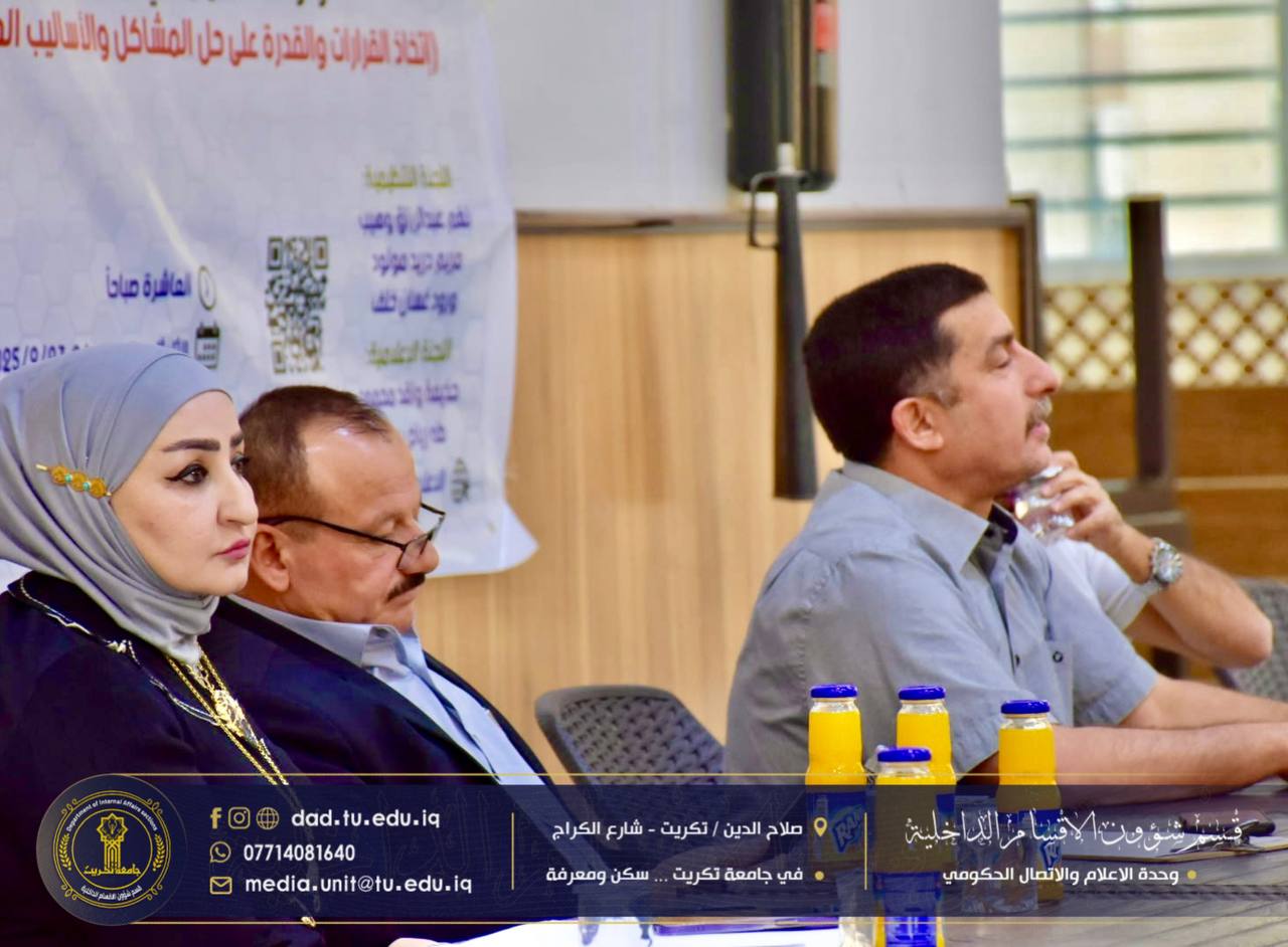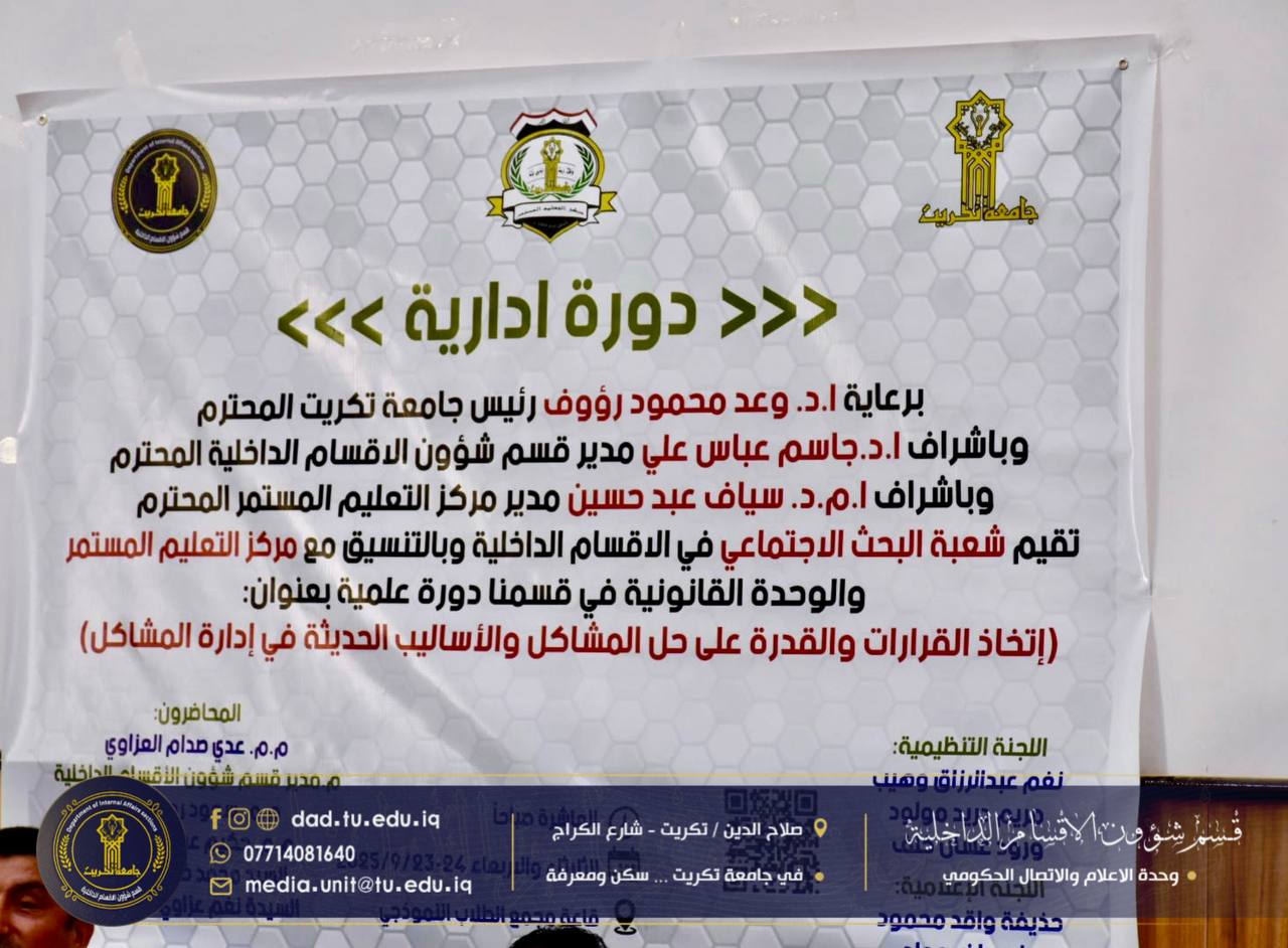 برعاية الأستاذ الدكتور وعد محمود رؤوف رئيس جامعة تكريت، وبإشراف الأستاذ الدكتور جاسم عباس علي مدير قسم شؤون الأقسام الداخلية، أقامت شعبة البحث الاجتماعي دورة تدريبية إدارية بعنوان “اتخاذ القرارات والقدرة على حل المشاكل والأساليب الحديثة في إدارة المشكلات” على قاعة مجمع الطالبات النموذجي، بمشاركة عدد من الكوادر الإدارية والإشرافية في الأقسام الداخلية.