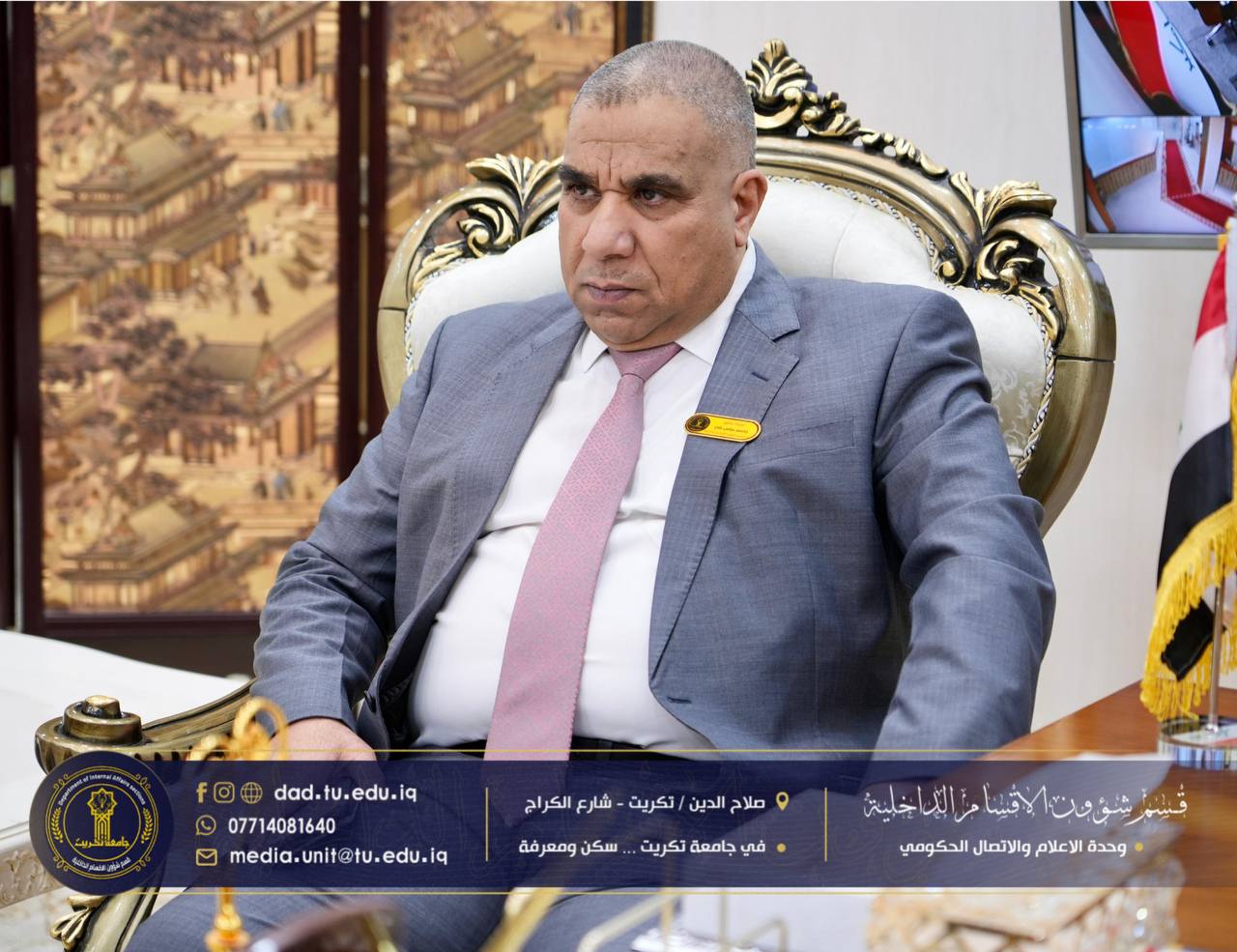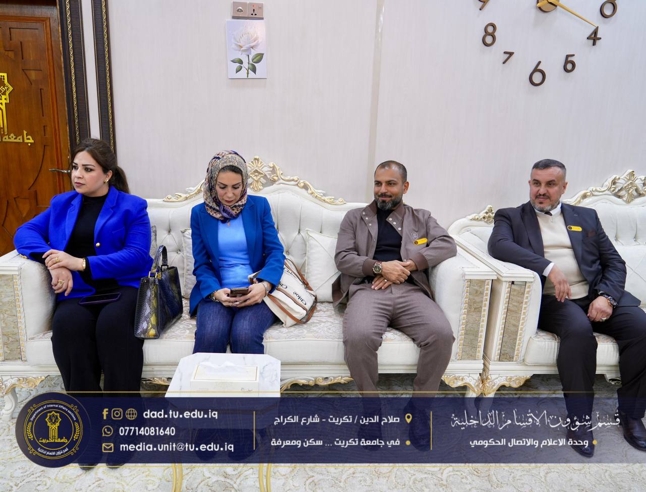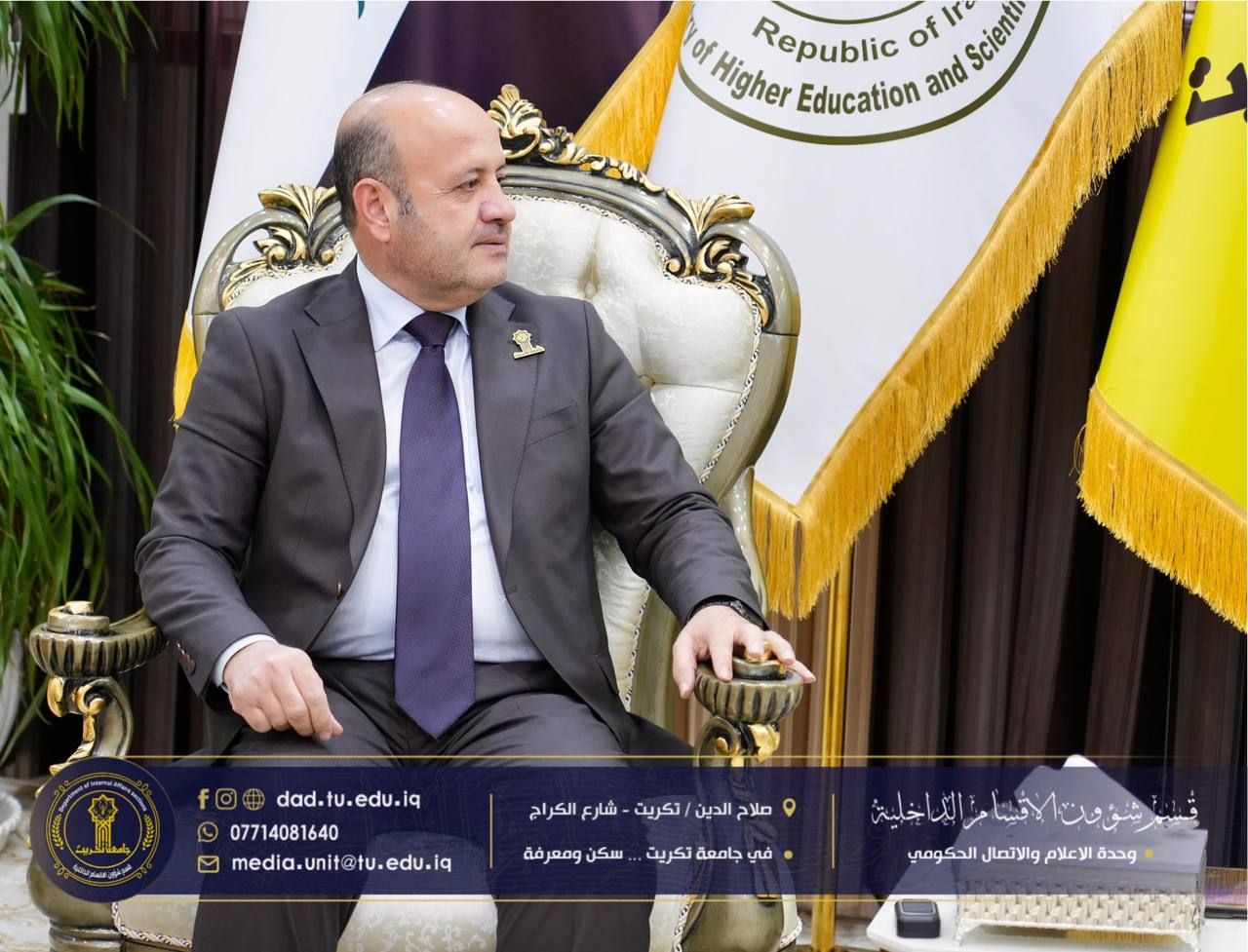 استقبل رئيس جامعة تكريت الأستاذ الدكتور وعد محمود رؤوف المحترم، لجنة جهاز الإشراف والتقويم برئاسة المدرس المساعد بسام كريم زيدان، وذلك في إطار متابعة الإجراءات الإدارية والفنية المعتمدة في الأقسام الداخلية، والاطلاع على مستوى الأداء المؤسسي والخدمي.