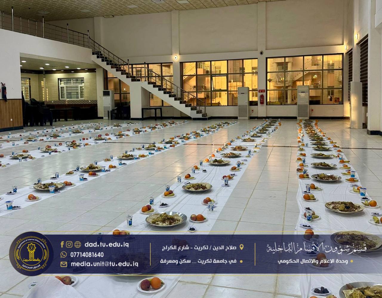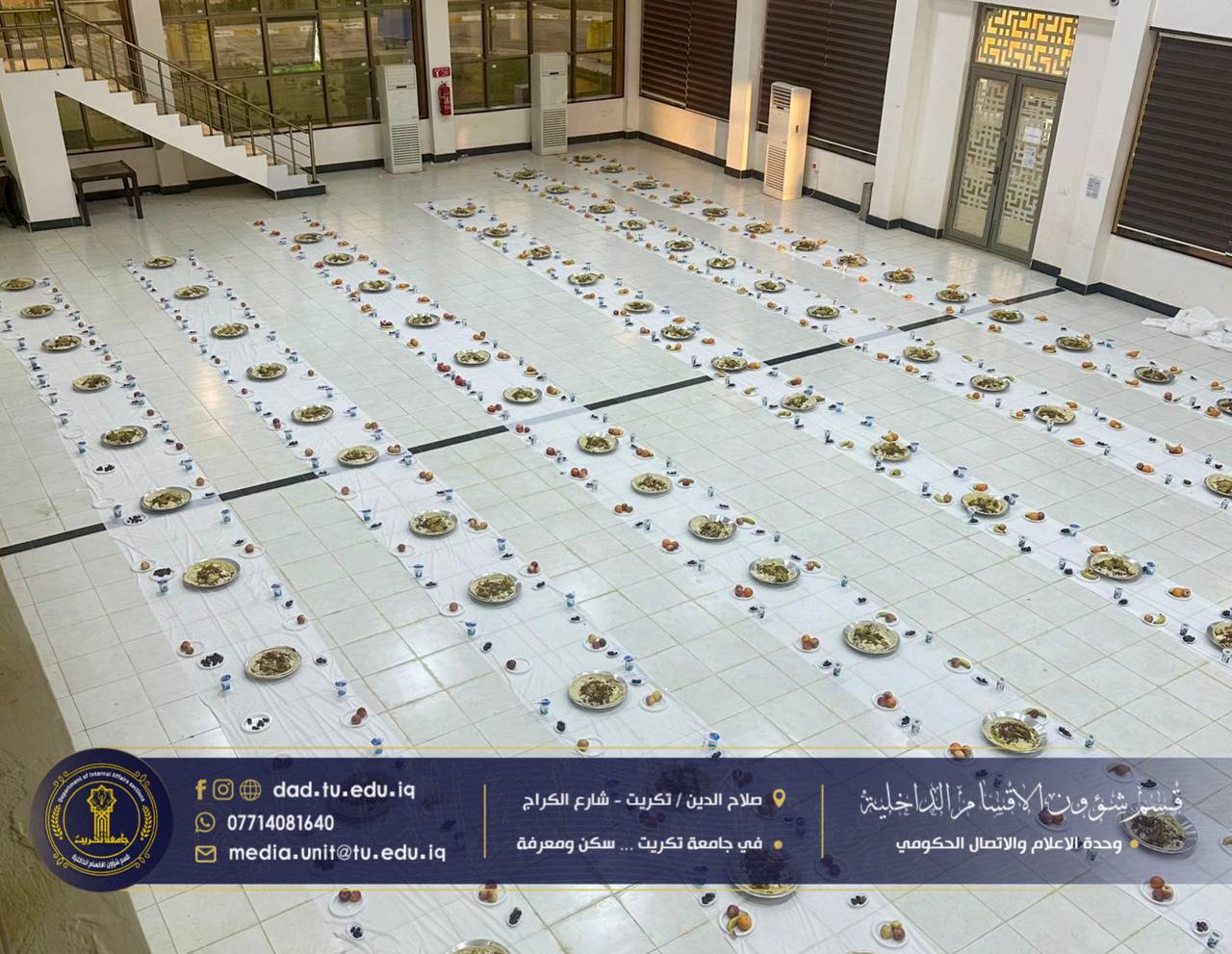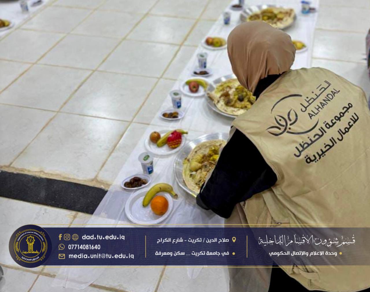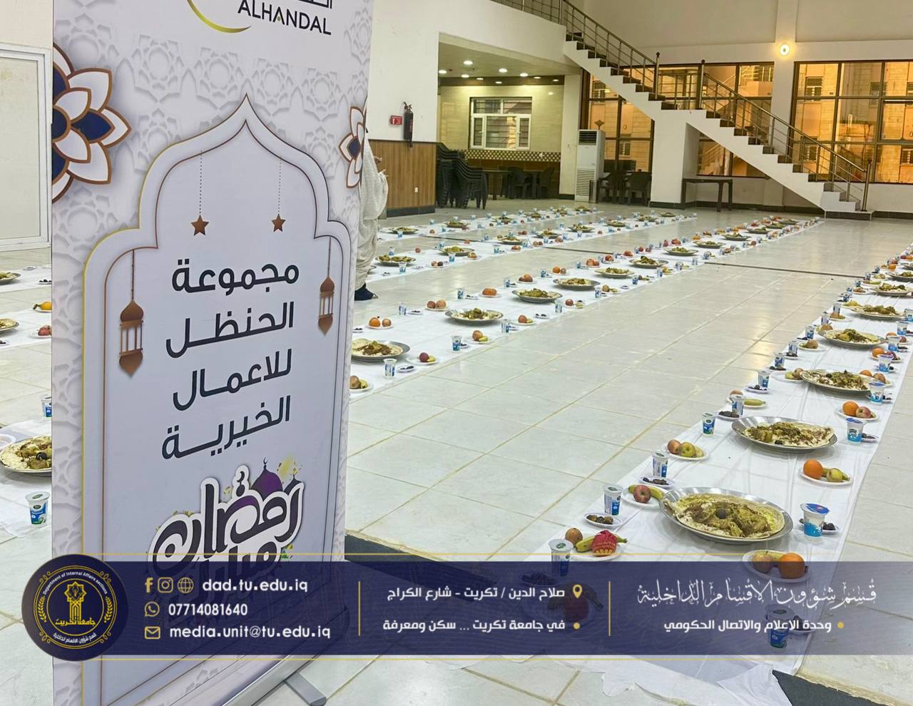 برعاية الأستاذ الدكتور وعد محمود رؤوف رئيس جامعة تكريت، وبإشراف مباشر من الأستاذ الدكتور جاسم عباس علي مدير قسم شؤون الأقسام الداخلية، أقيمت مأدبة إفطار رمضانية نظّمتها مجموعة الحنظل للأعمال الخيرية في مجمع الطالبات النموذجي، وذلك خدمةً للطالبات الساكنات فيه، تزامناً مع أجواء شهر رمضان المبارك.