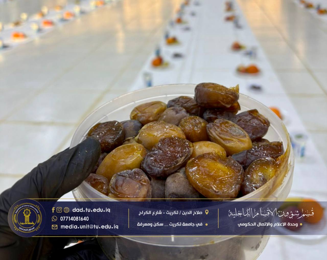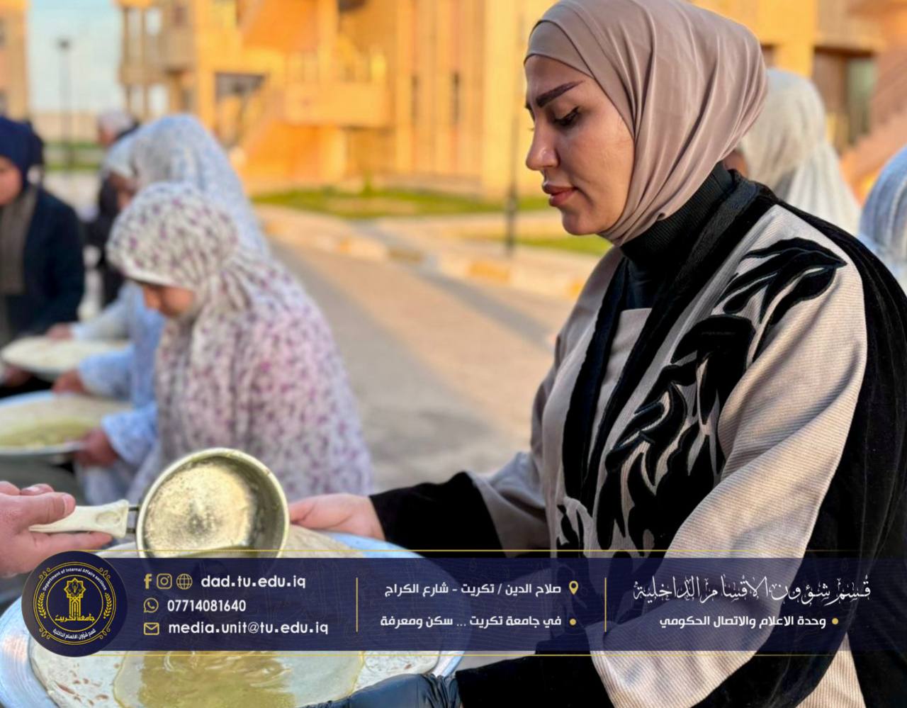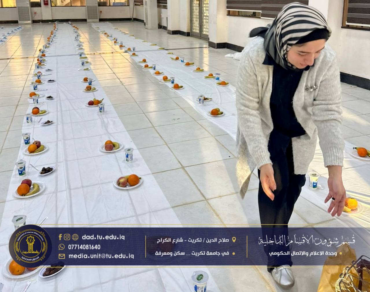وتأتي هذه المبادرة ضمن سلسلة من الأنشطة والفعاليات الرمضانية التي تشهدها الأقسام الداخلية في جامعة تكريت، والتي تهدف إلى توفير أجواء روحانية واجتماعية تعكس معاني الشهر الفضيل وتعزز روح التعاون والتآخي بين الطلبة.