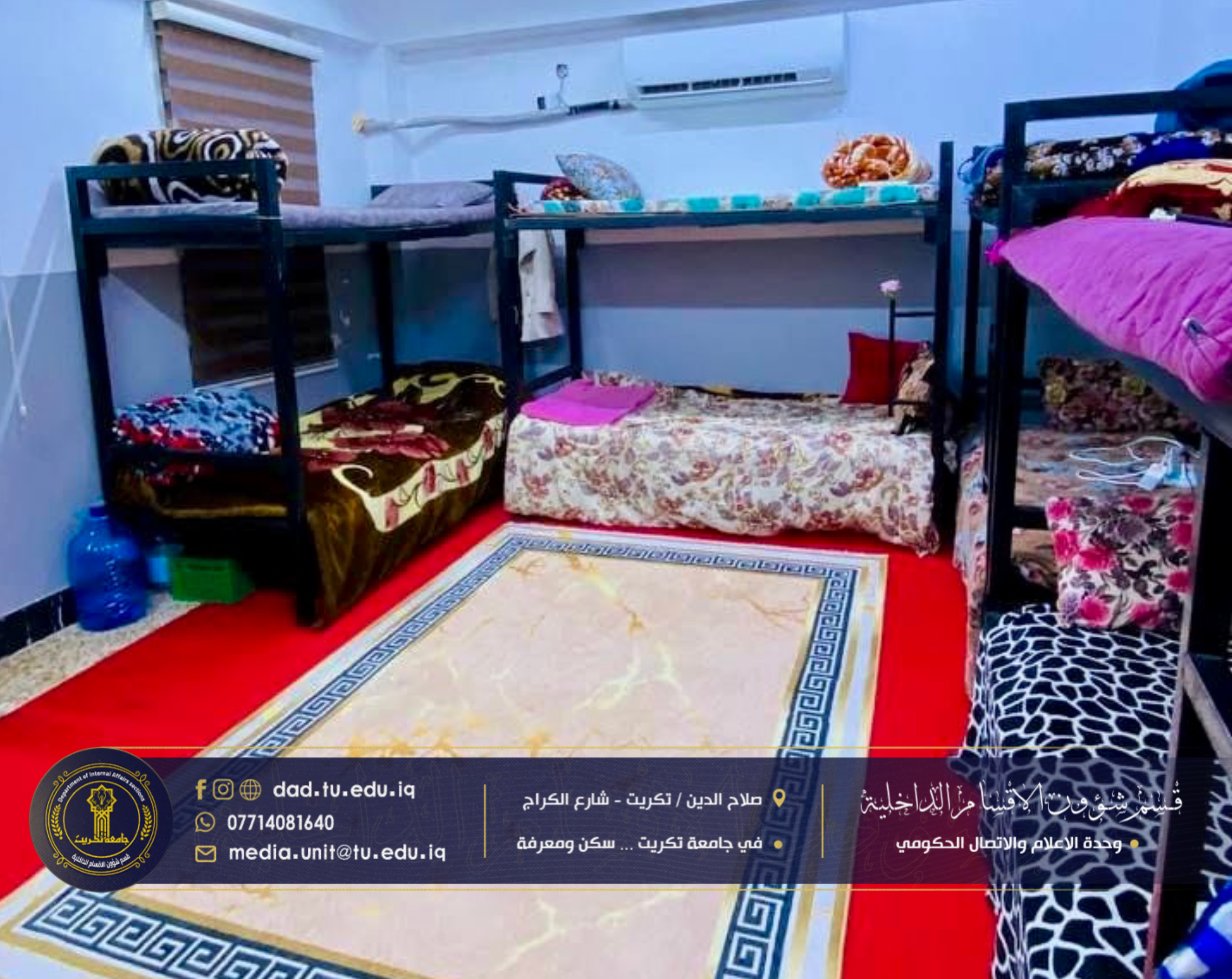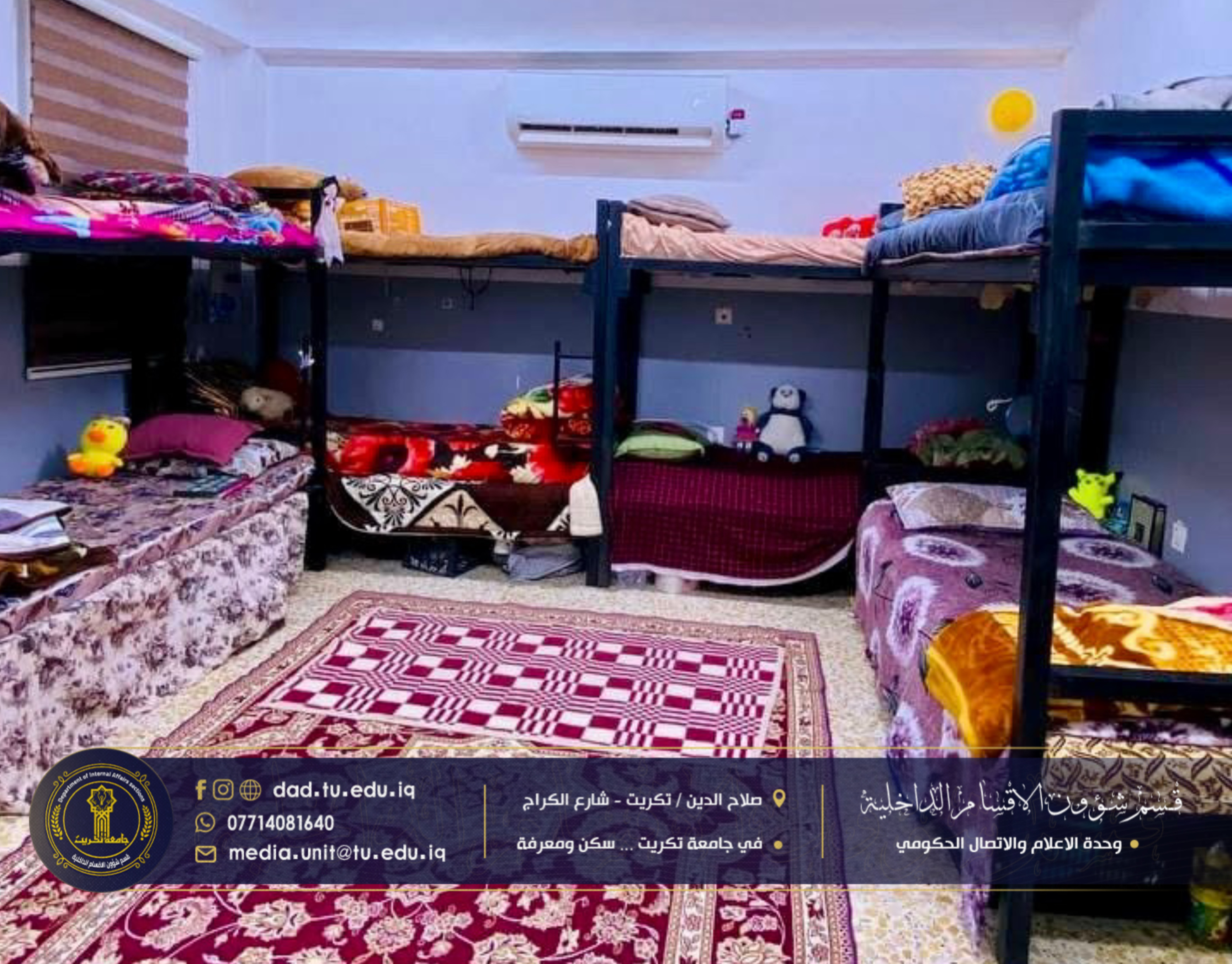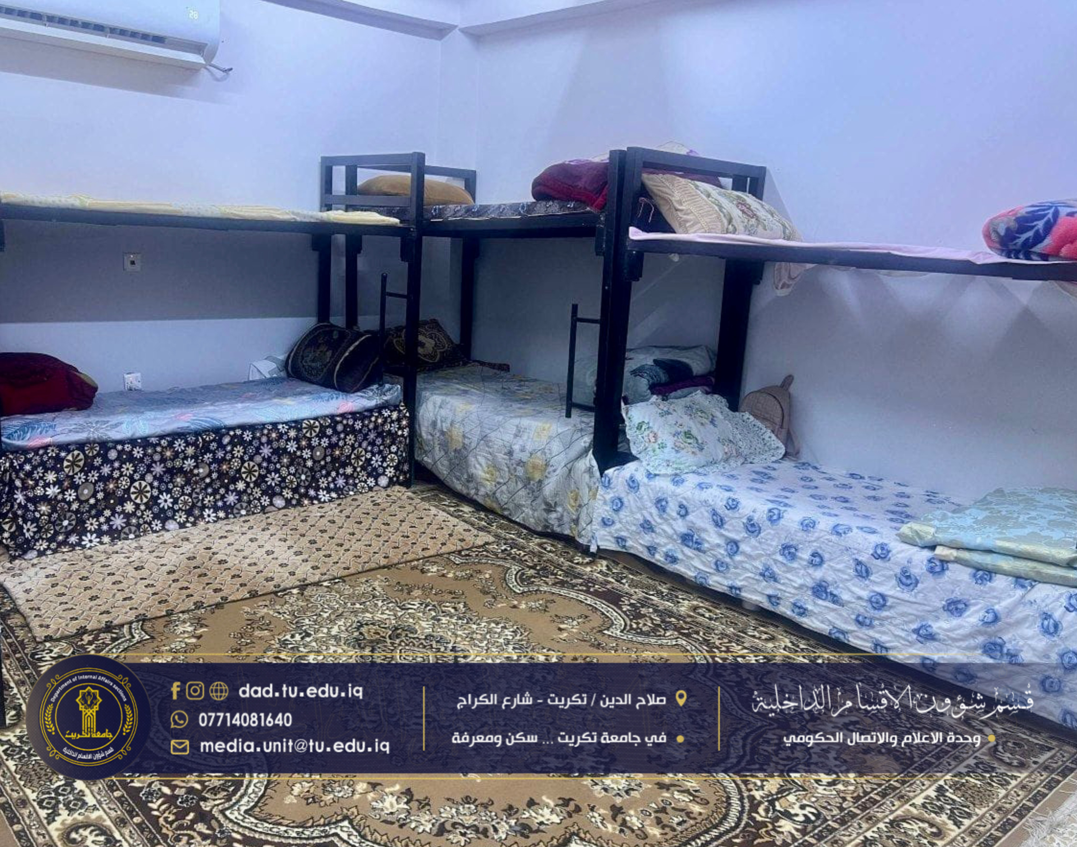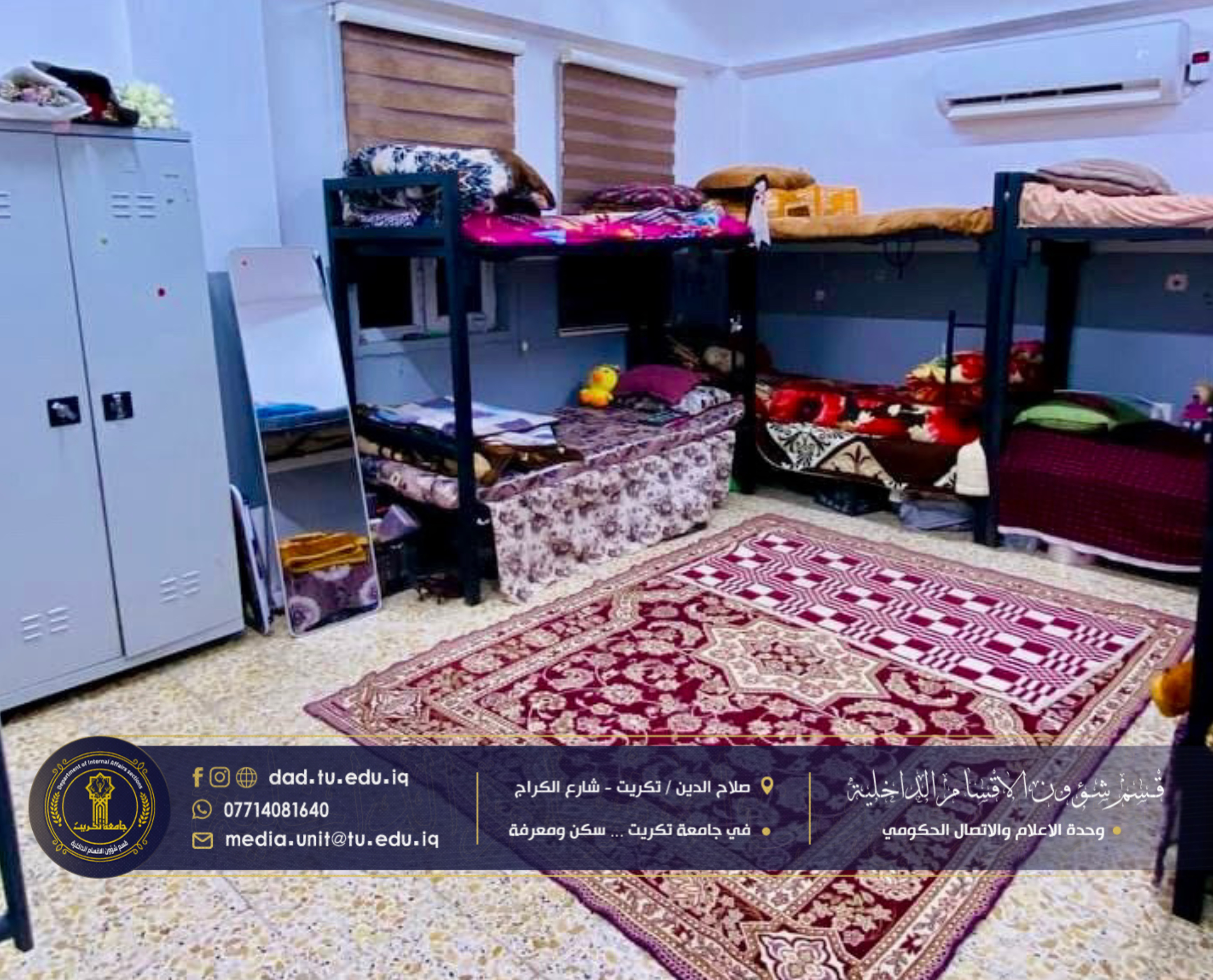 في إطار حرص إدارة الأقسام الداخلية بجامعة تكريت على توفير بيئة سكنية ملائمة ومتكاملة للطالبات، وبمتابعة من الأستاذ الدكتور جاسم عباس علي مدير الأقسام الداخلية، يواصل كادر الإشراف في مجمع الطالبات النموذجي توثيق الشقق والغرف النموذجية الخاصة بسكن الطالبات.