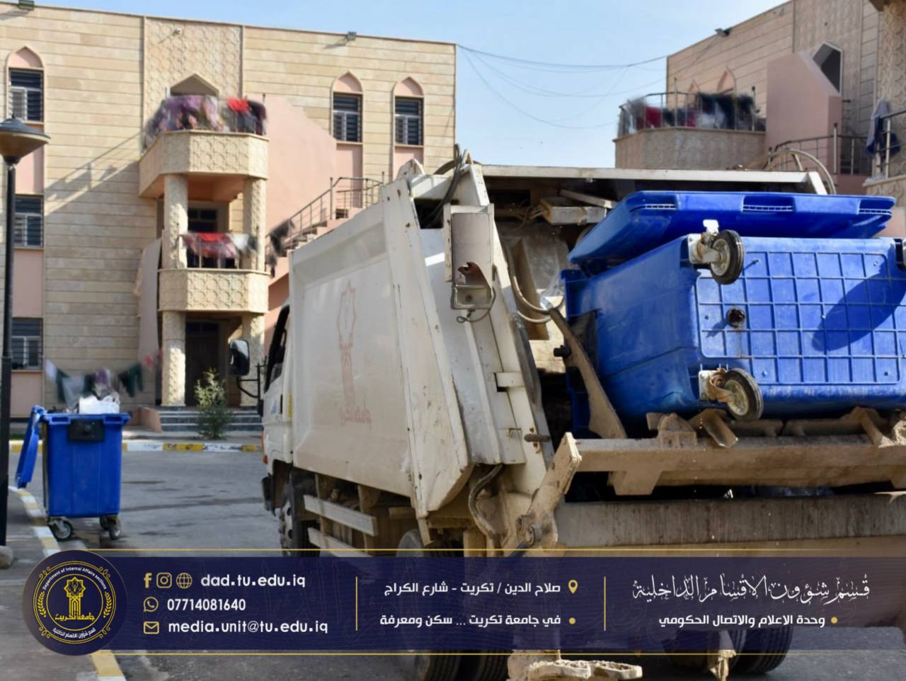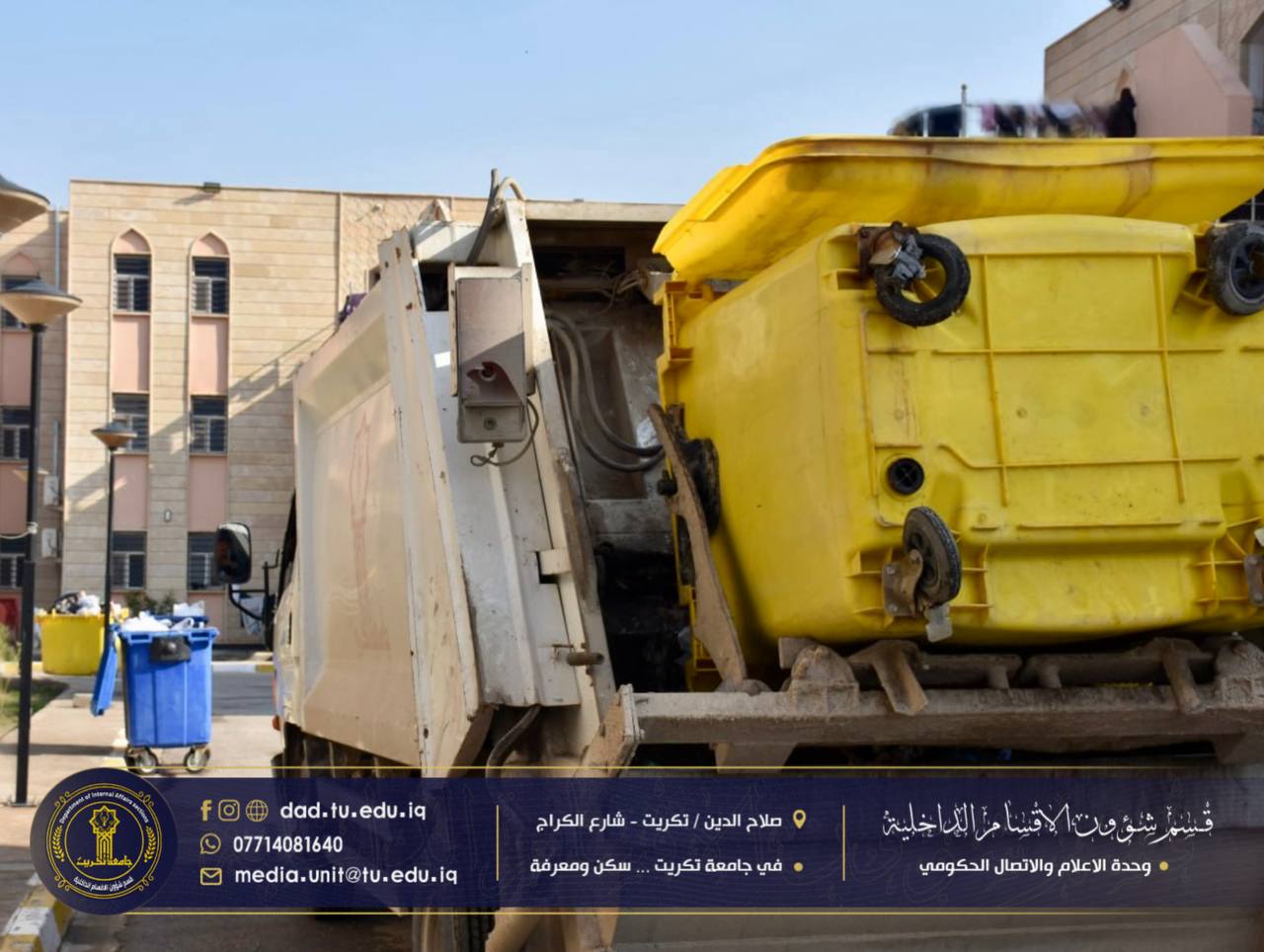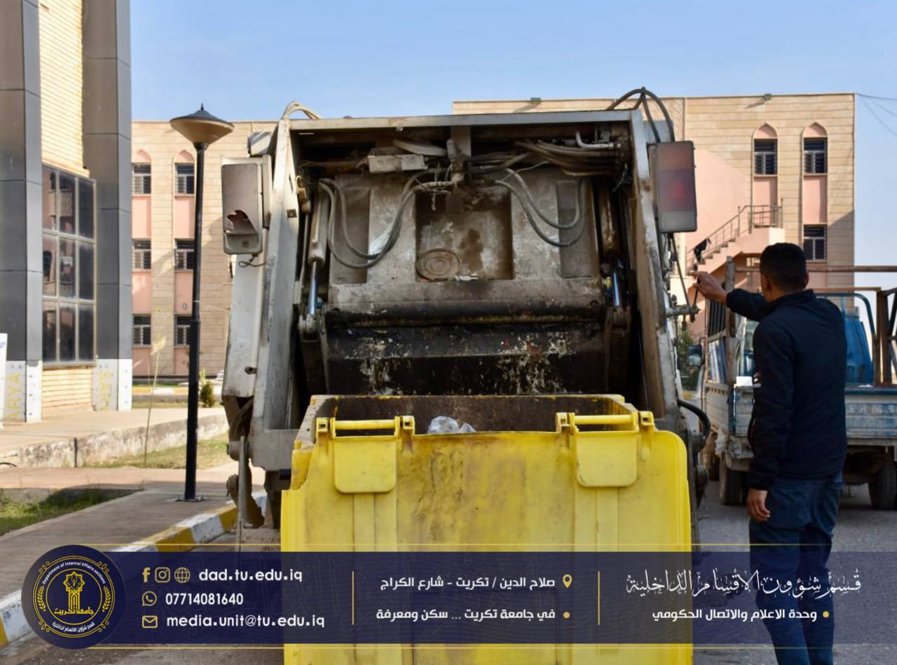 تواصل وحدة الخدمات التابعة لشعبة الصيانة في قسم شؤون الأقسام الداخلية جهودها اليومية في متابعة أعمال رفع الحاويات والنفايات من المجمعات السكنية، وذلك ضمن خطتها الهادفة إلى الحفاظ على بيئة سكنية نظيفة للطلبة.