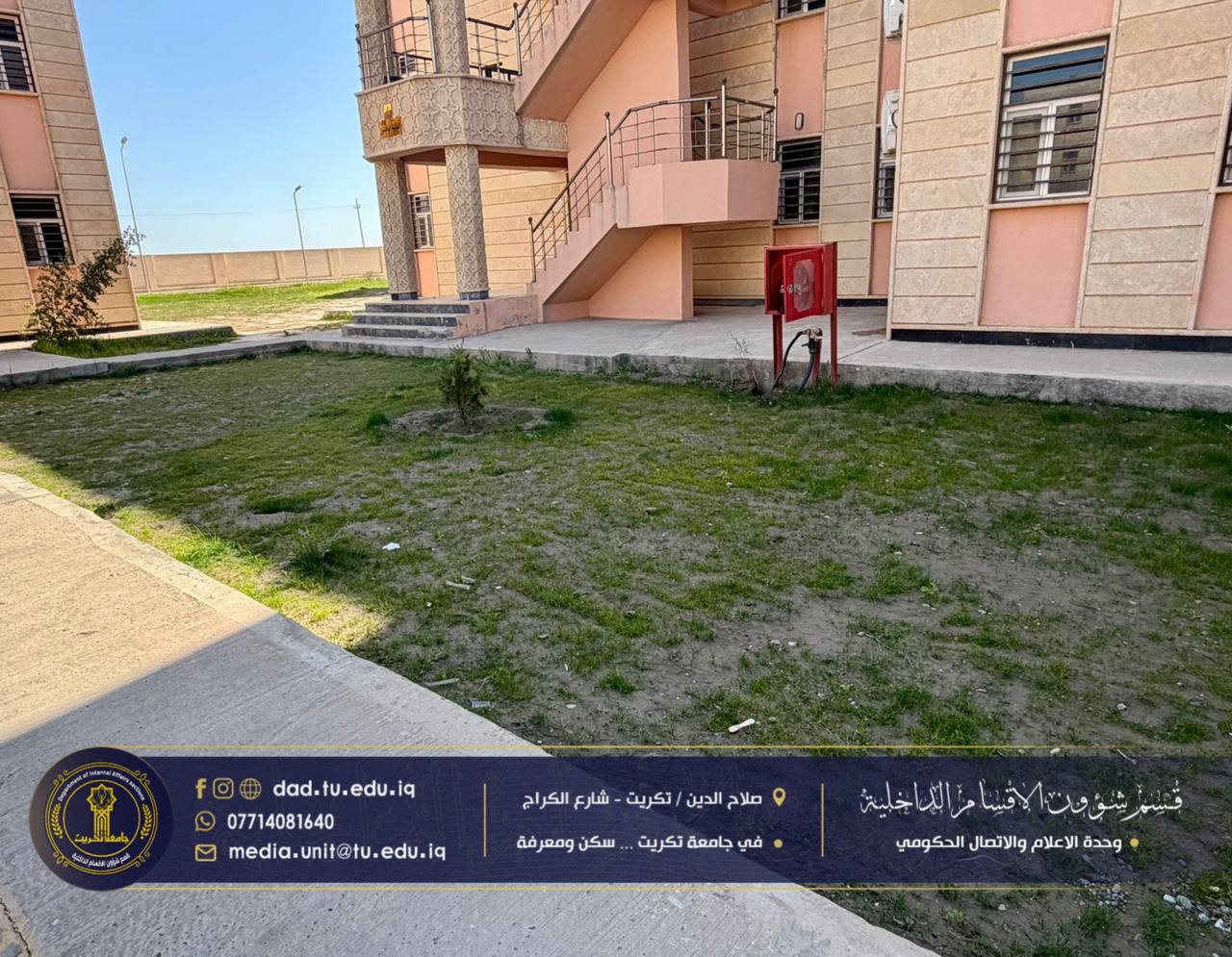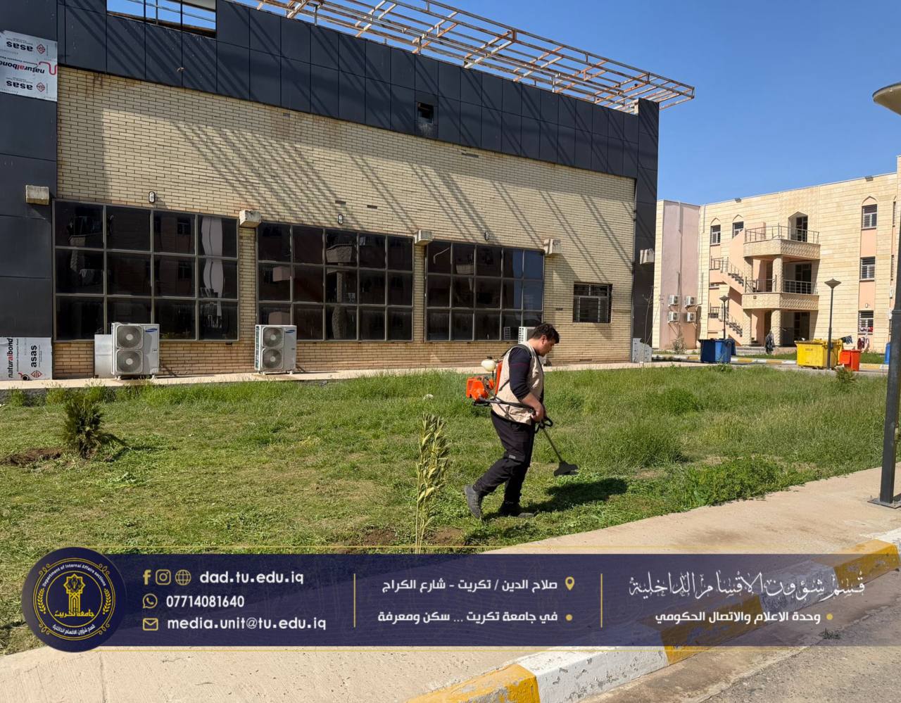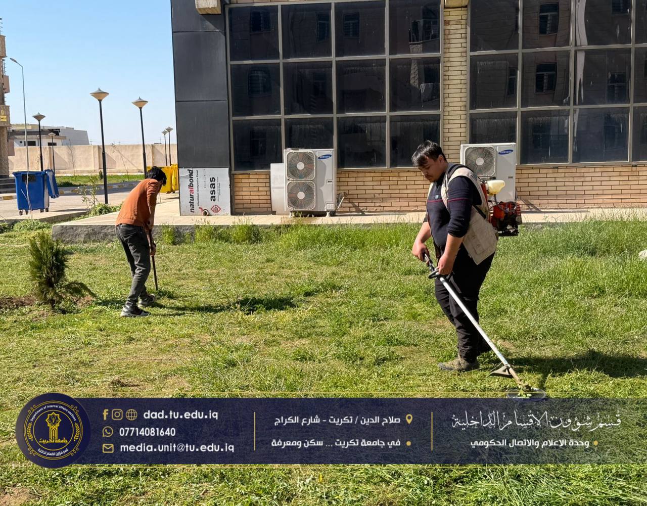 ضمن الجهود المتواصلة للارتقاء ببيئة السكن الجامعي وتوفير أجواء ملائمة للطالبات، وبمتابعة مباشرة من الأستاذ الدكتور جاسم عباس علي مدير الأقسام الداخلية، وبإشراف السيد همام نزهان محمد مسؤول شعبة الصيانة والخدمات، باشرت وحدة الحدائق بأعمال قص وتنظيف المساحات الخضراء في مجمع الطالبات النموذجي.