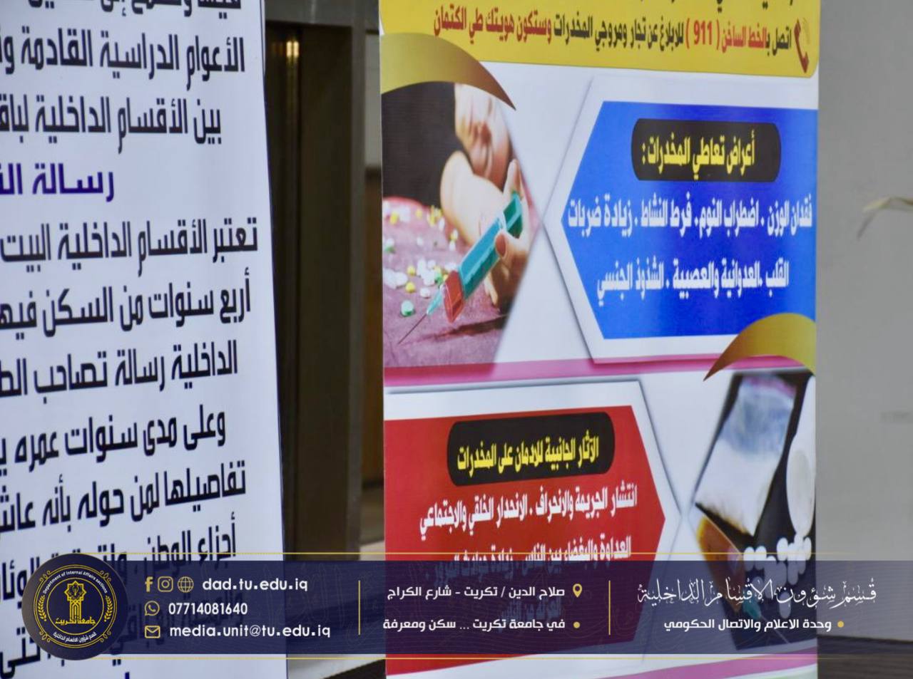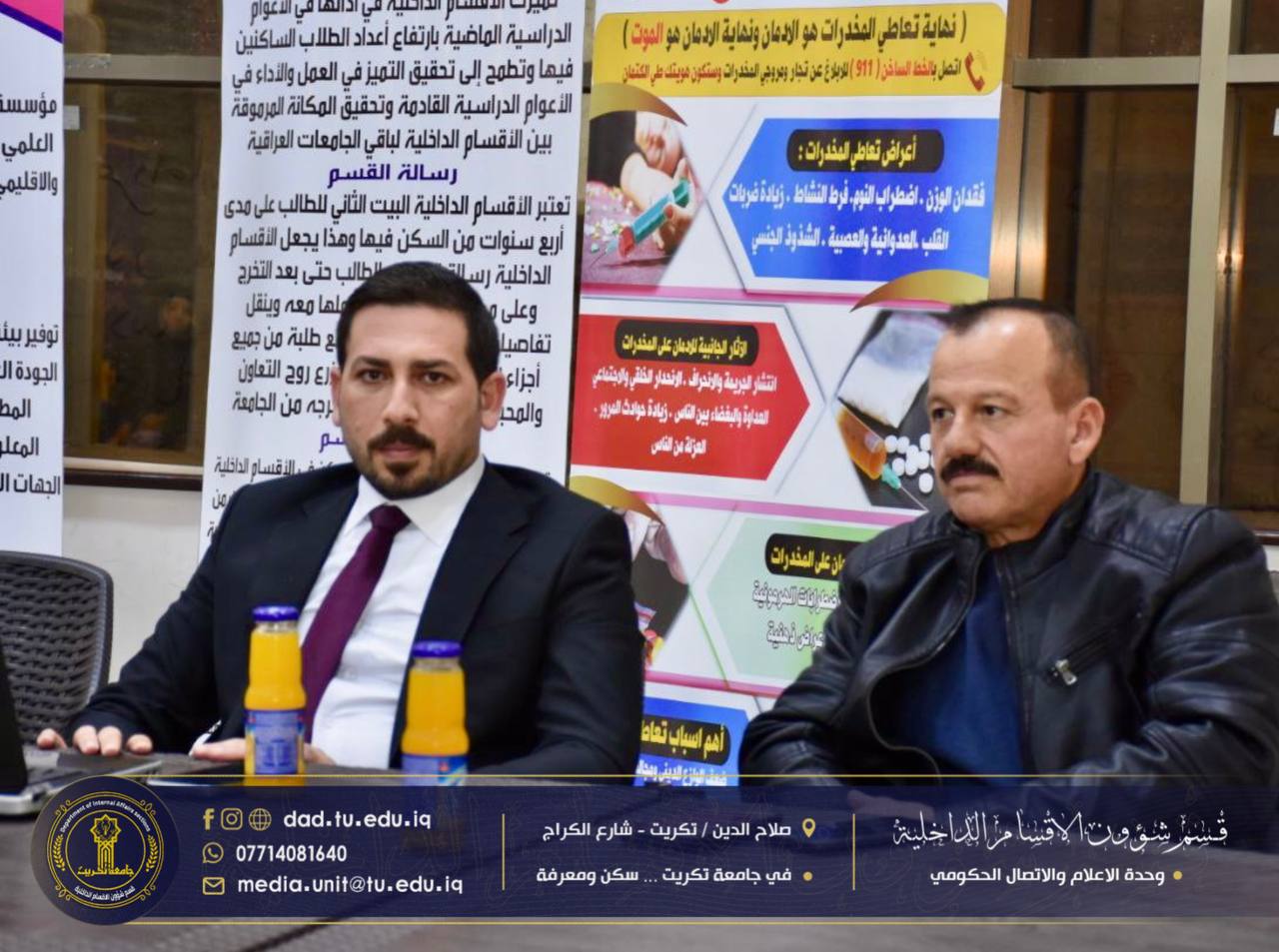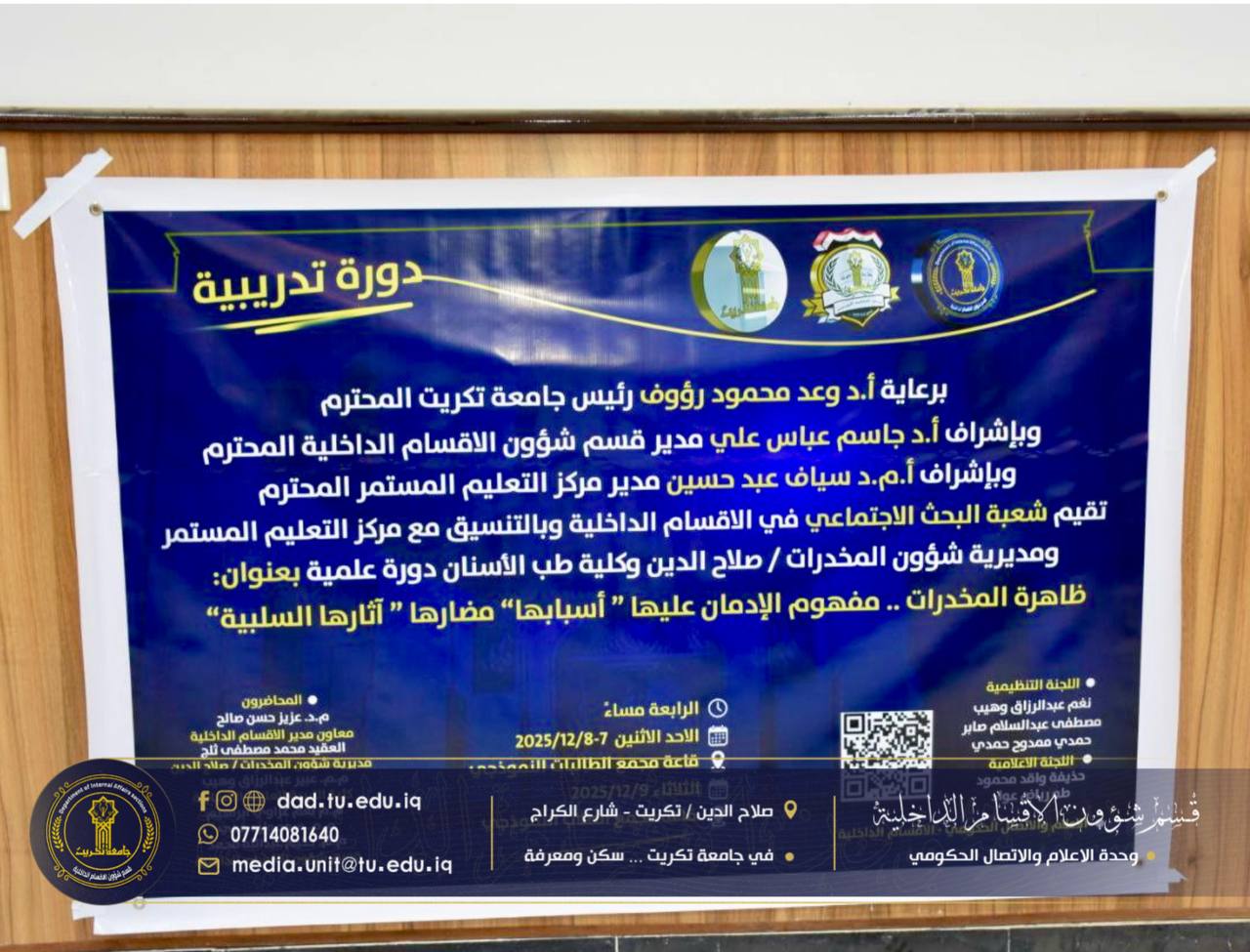 برعاية رئيس جامعة تكريت الأستاذ الدكتور وعد محمود رؤوف المحترم، وبإشراف مدير قسم شؤون الأقسام الداخلية الأستاذ الدكتور جاسم عباس علي المحترم، اختتمت شعبة البحث الاجتماعي في الأقسام الداخلية دورتها التوعوية الموسومة (ظاهرة المخدرات… مفهوم الإدمان عليها، أسبابها، مضارها وآثارها السلبية)، والتي نُظمت بالتنسيق مع مديرية شؤون المخدرات في محافظة صلاح الدين وكلية التربية للعلوم الإنسانية.