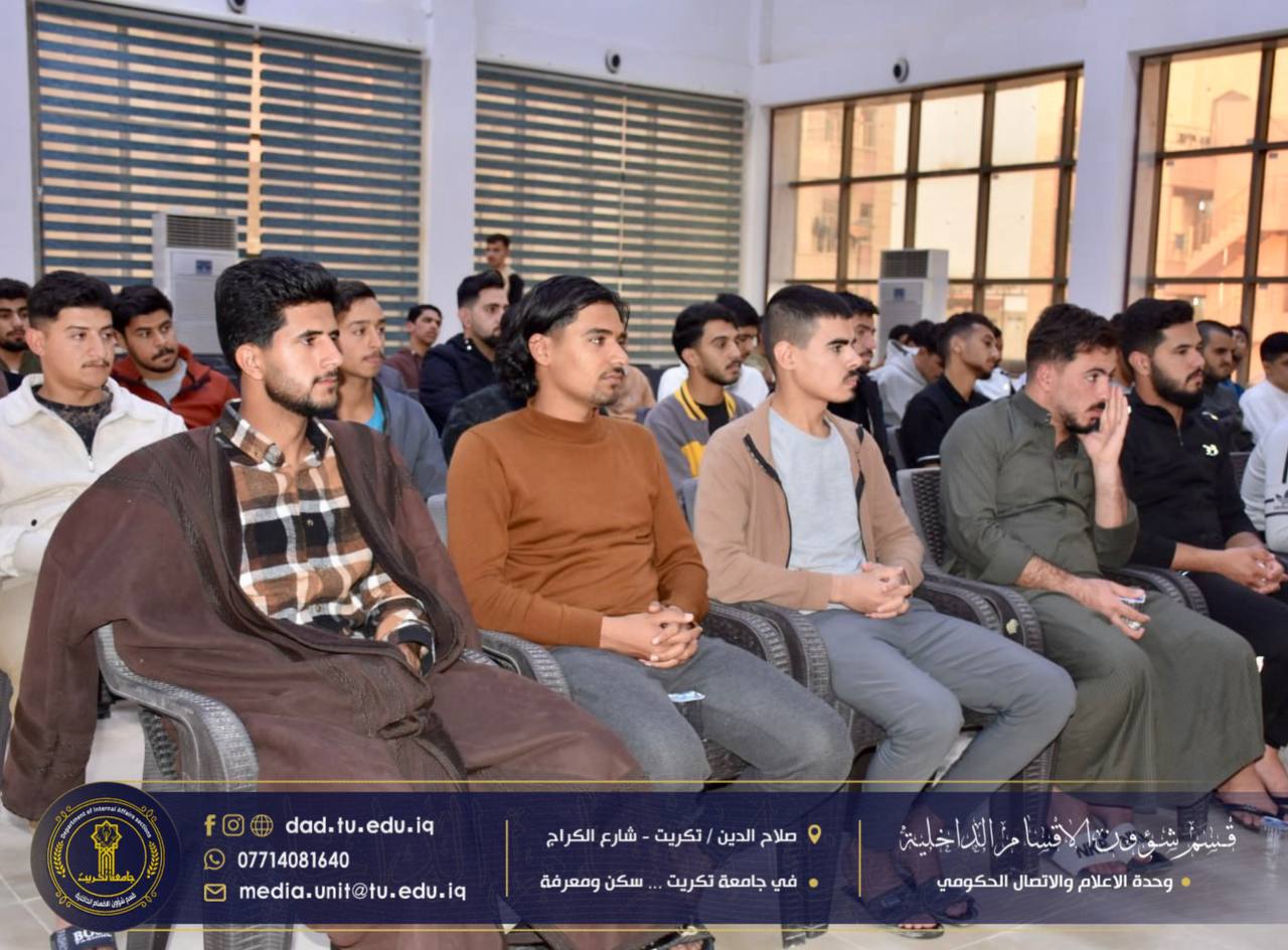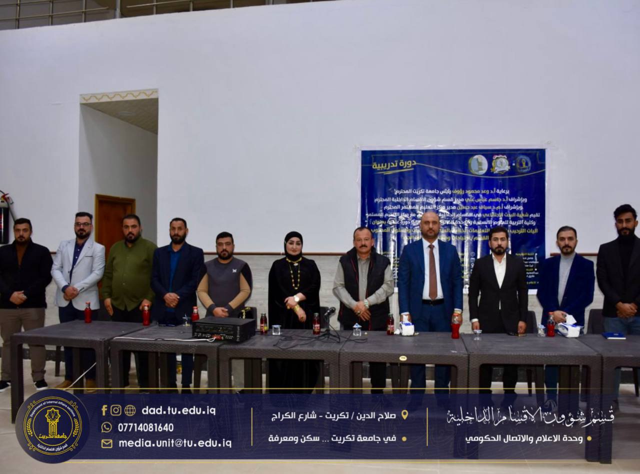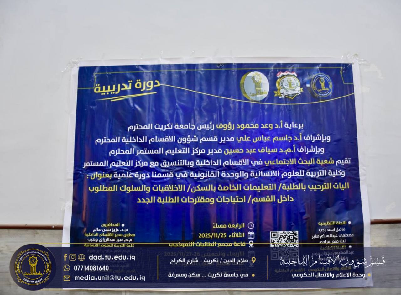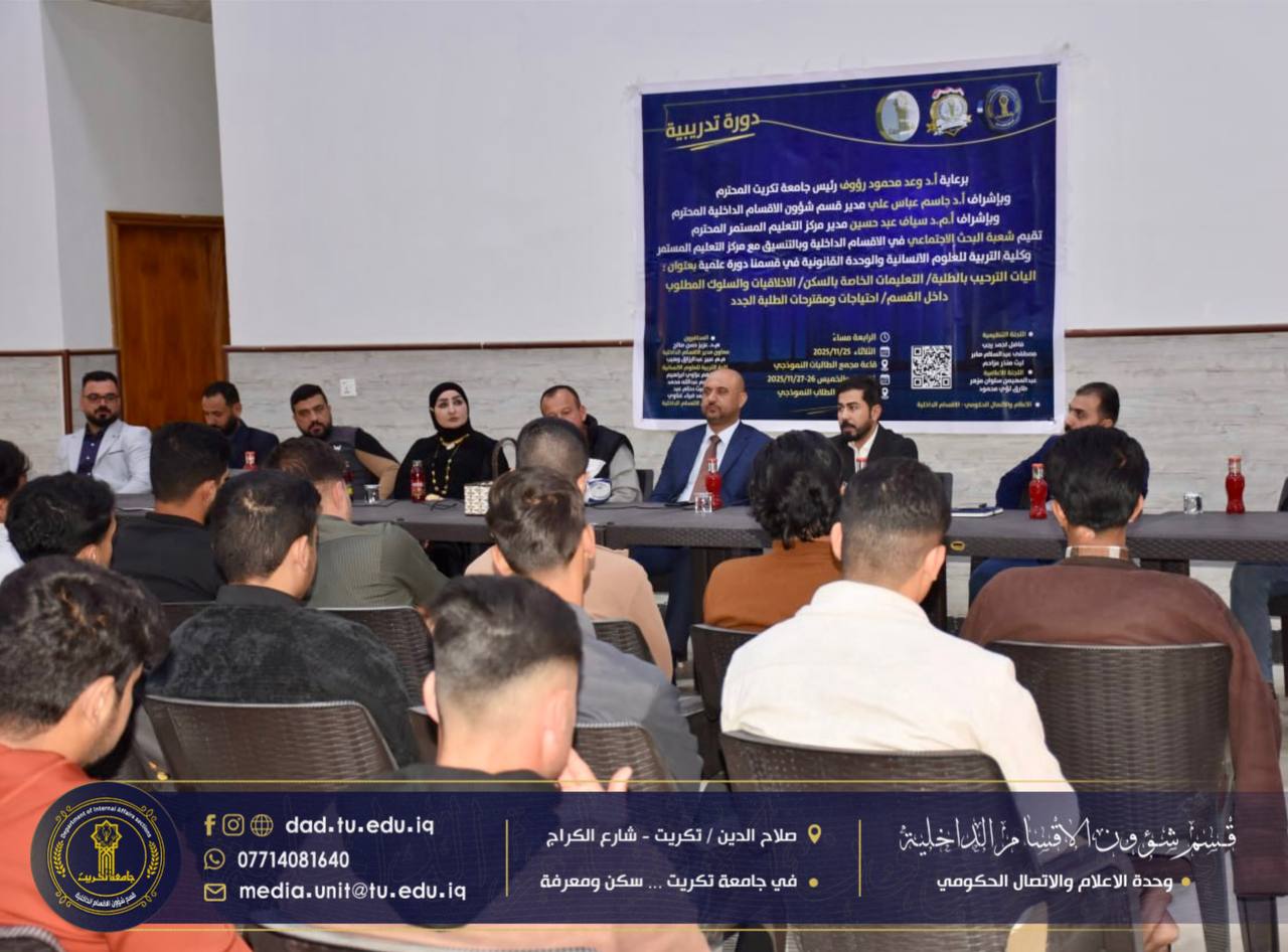 برعاية الاستاذ الدكتور وعد محمود رؤوف رئيس جامعة تكريت المحترم، وبإشراف الاستاذ الدكتور جاسم عباس علي مدير قسم شؤون الاقسام الداخلية المحترم، اختتمت شعبة البحث الاجتماعي في الأقسام الداخلية بجامعة تكريت،دورتها الموسومة “آليات الترحيب بالطلبة والتعليمات الخاصة بالسكن”، والتي استمرت لمدة ثلاثة أيام على قاعة مجمع الطلاب النموذجي.