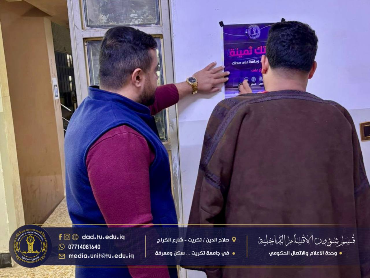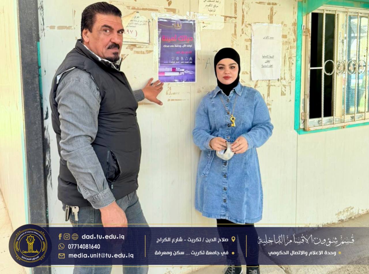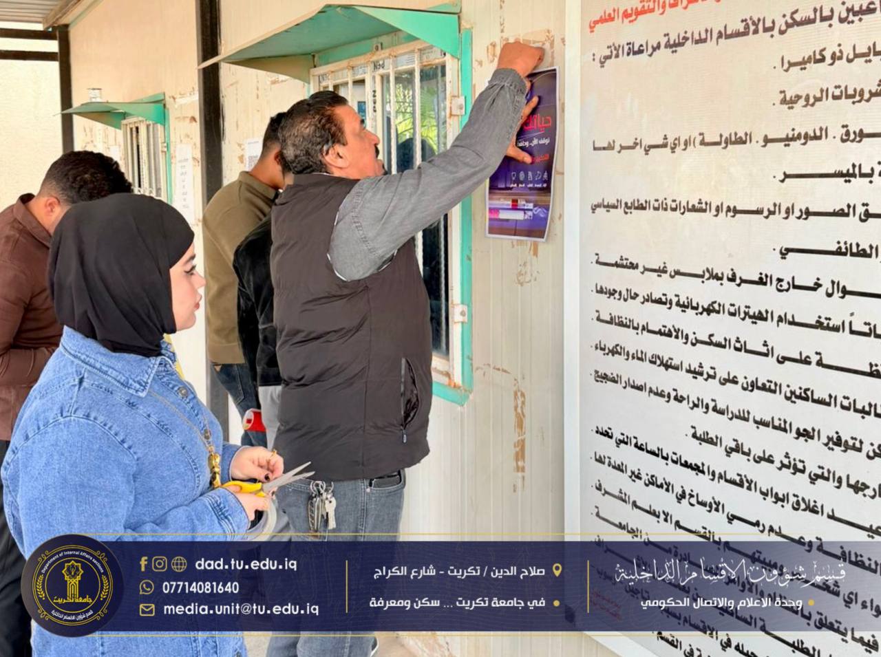 ضمن خطط قسم شؤون الأقسام الداخلية في جامعة تكريت للارتقاء بالوعي الطلابي وتعزيز بيئة سكنية صحية وآمنة، نفذت كوادر شعبة البحث الاجتماعي حملة ميدانية شاملة لتثبيت البوسترات التوعوية الخاصة بمخاطر المخدرات والتدخين في جميع مجمعات الطلبة.