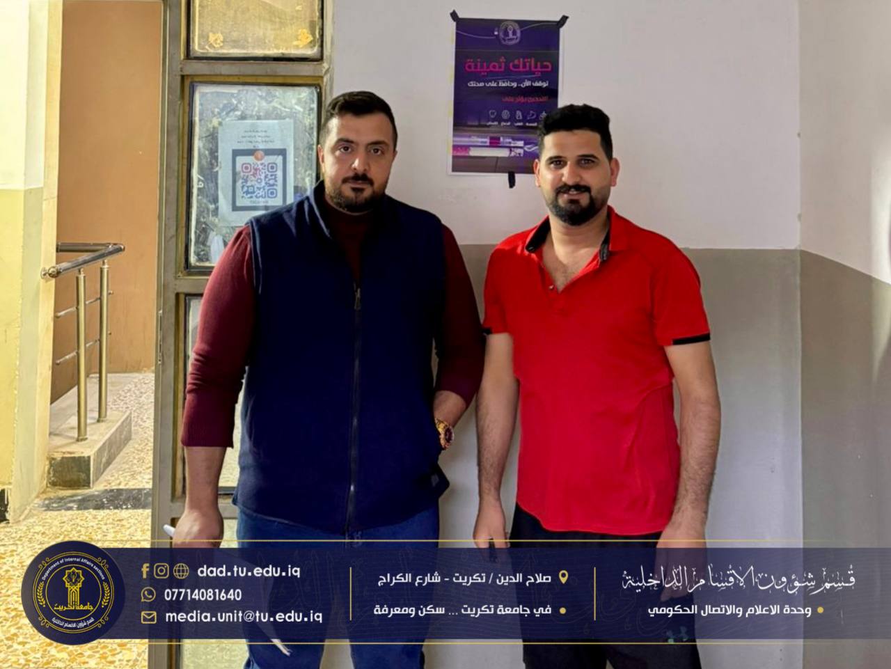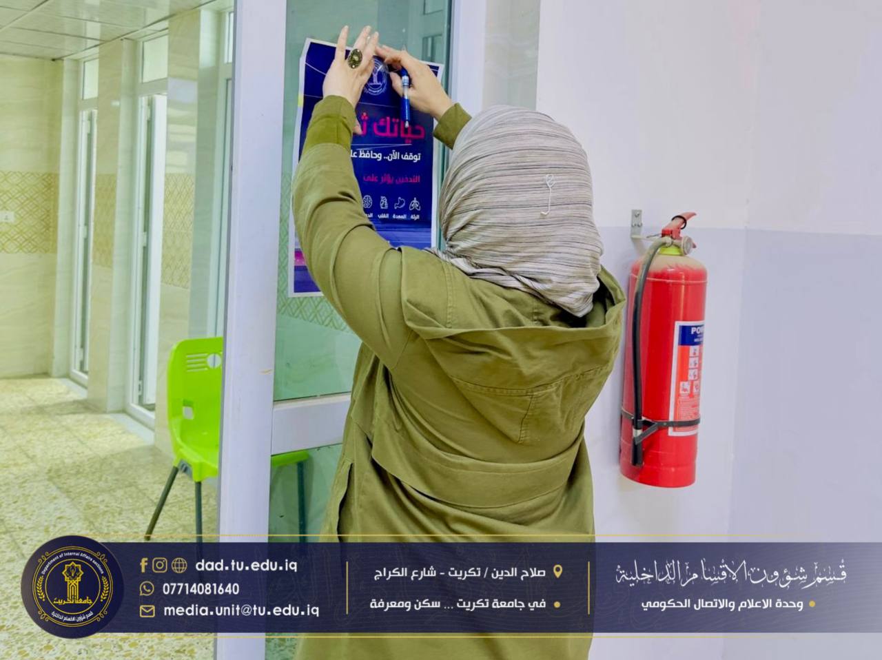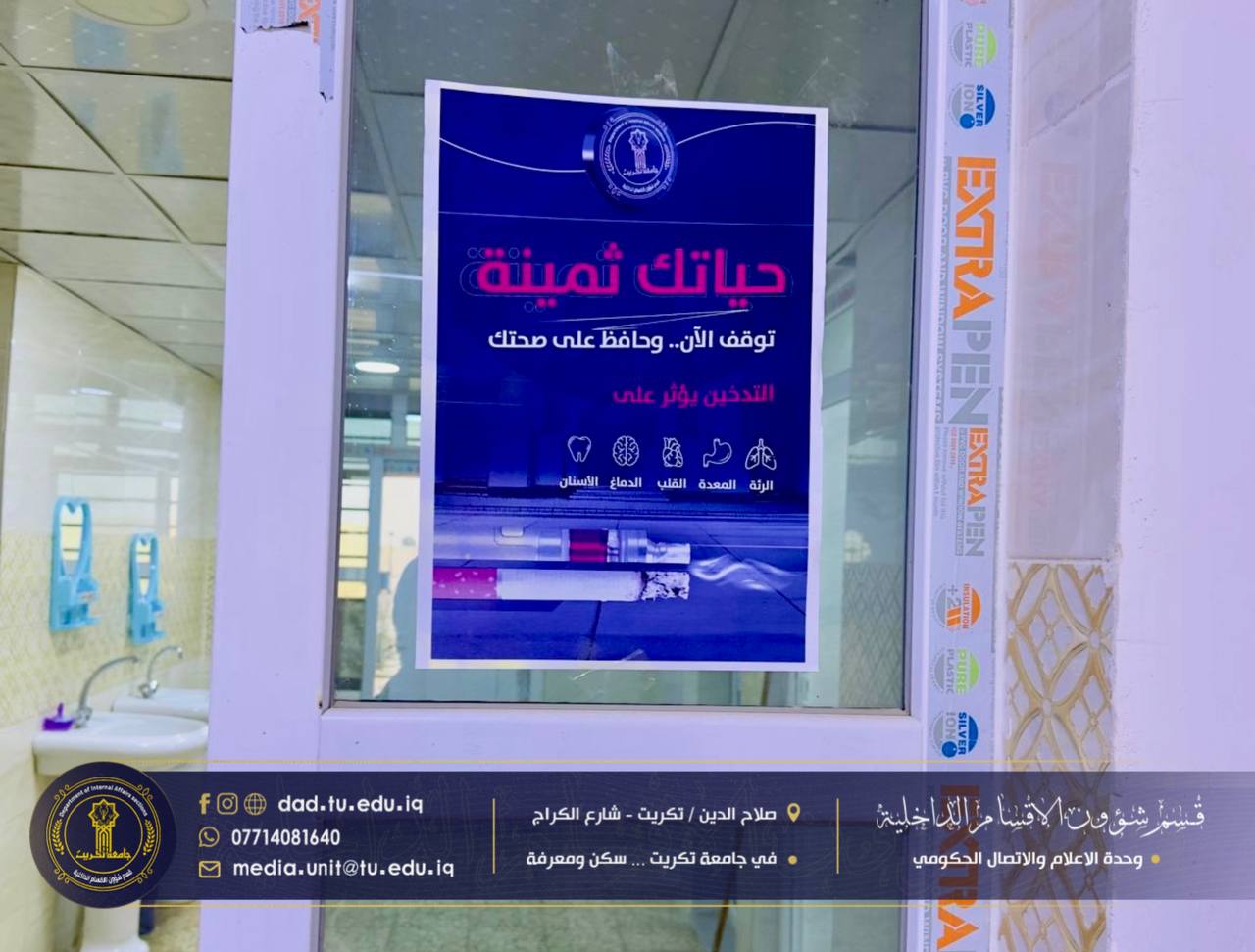 ضمن خطط قسم شؤون الأقسام الداخلية في جامعة تكريت للارتقاء بالوعي الطلابي وتعزيز بيئة سكنية صحية وآمنة، نفذت كوادر شعبة البحث الاجتماعي حملة ميدانية شاملة لتثبيت البوسترات التوعوية الخاصة بمخاطر المخدرات والتدخين في جميع مجمعات الطلبة.